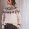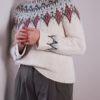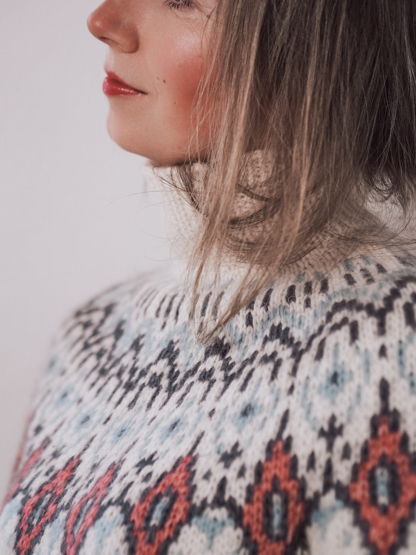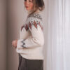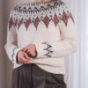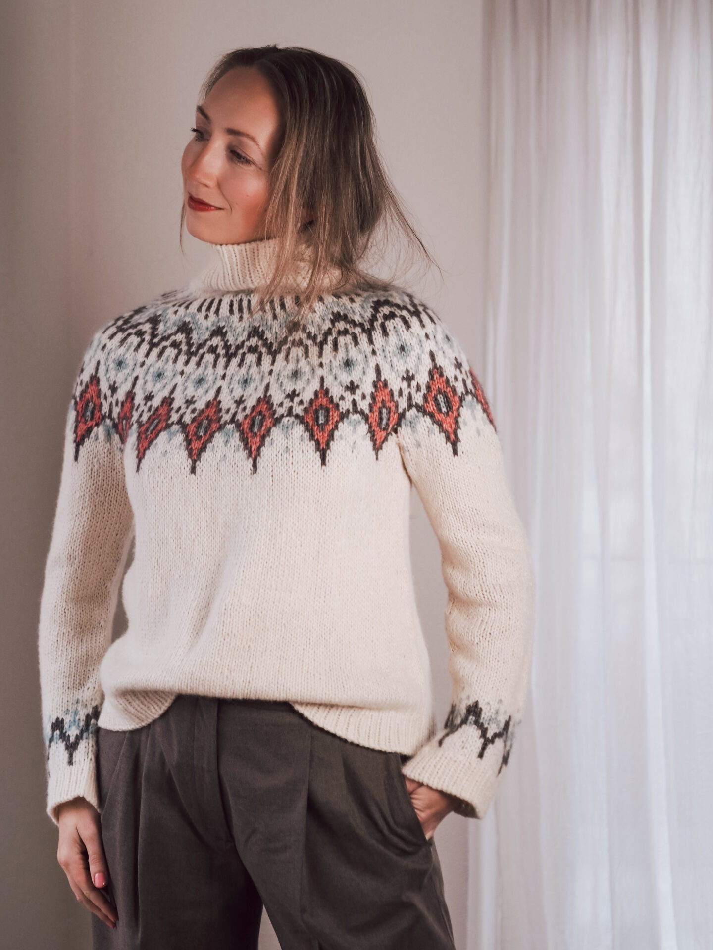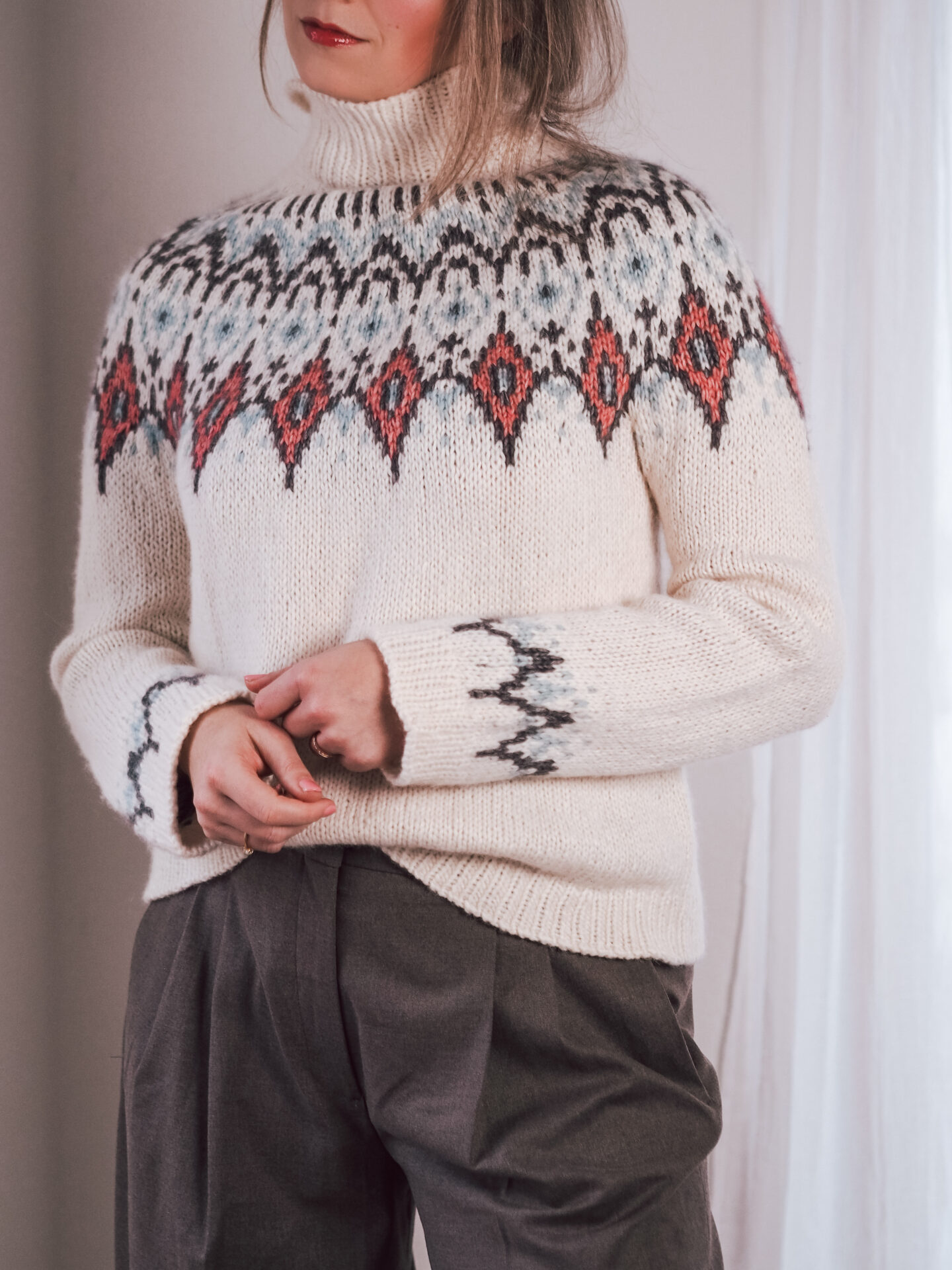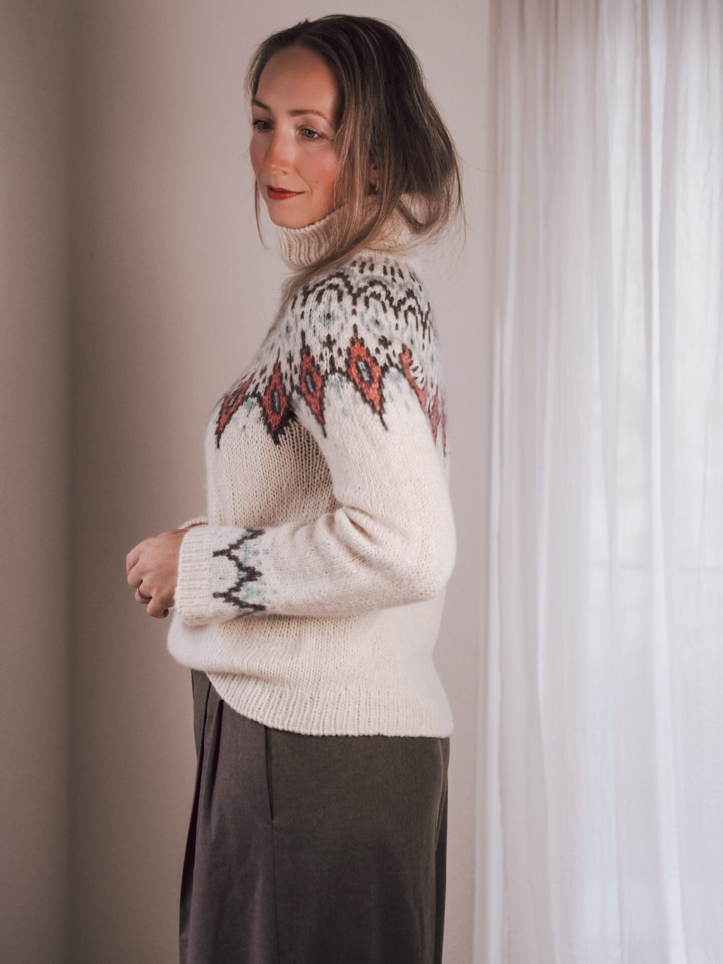 The pattern is knitted in BC Garn Brisa, a soft DK-weight blown yarn, using 5.5 mm and 5 mm needles. The sweater is worked in the round with short rows shaping the neckline and stranded colorwork throughout the yoke and cuffs. With a gauge of 16 stitches per 10 cm, the design offers a comfortable fit with positive ease.
