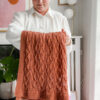 The blanket is worked back and forth with a continuous seed-stitch edge along the sides. The leaf pattern forms the center panel and is knitted over a 16-row repeat, which is repeated both in width and length. This construction creates an even and balanced look, and the pattern opens beautifully after washing and blocking.