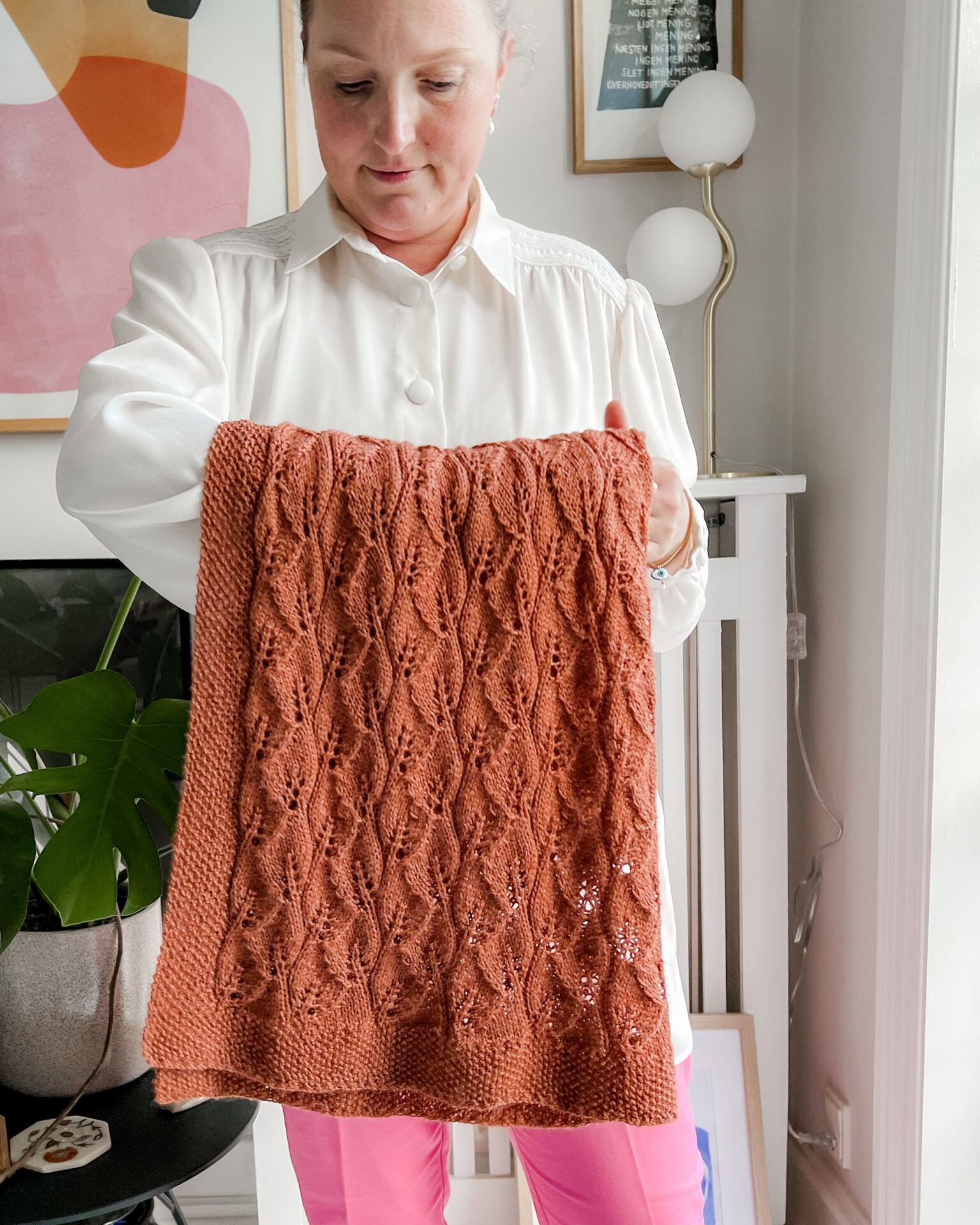 Leafy Baby Blanket measures approx. 75 x 75 cm after soaking and blocking. The size is easy to adjust if a more rectangular blanket is desired. This can be done by knitting 1–2 fewer pattern repeats in width and/or adding extra repeats in length. This makes the pattern flexible and suitable for different needs.