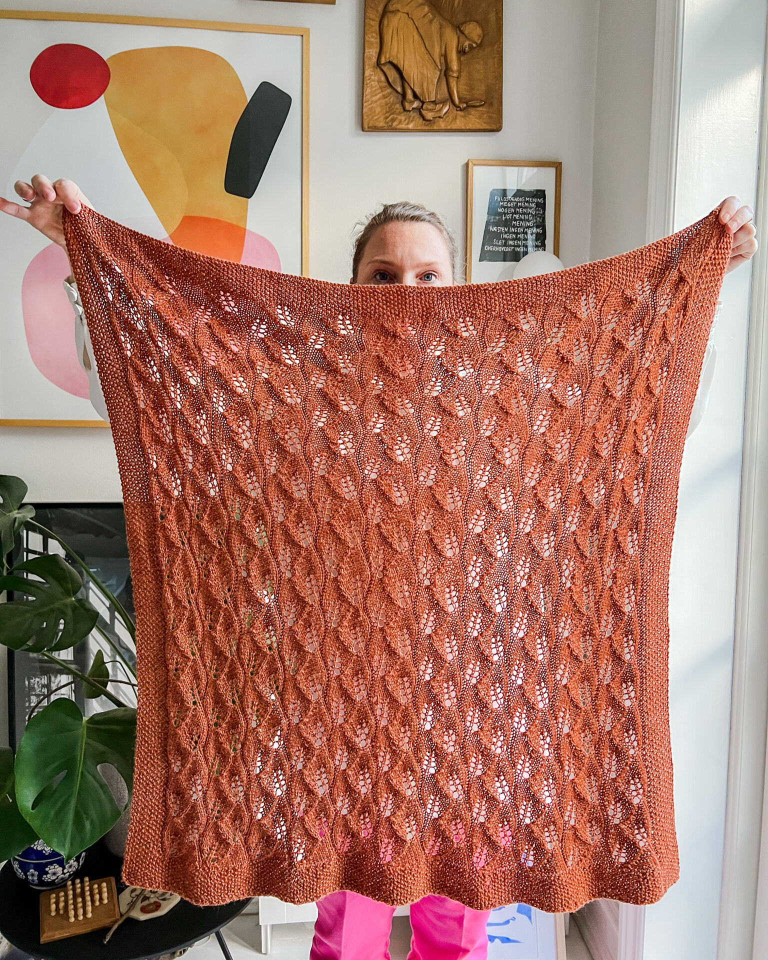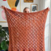 Gauge after soaking and blocking is 23 sts in seed stitch and 27 sts in the patterned section on 3 mm needles. For the best result, thorough blocking is recommended, so the leaf pattern opens up and the blanket reaches its final shape.