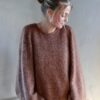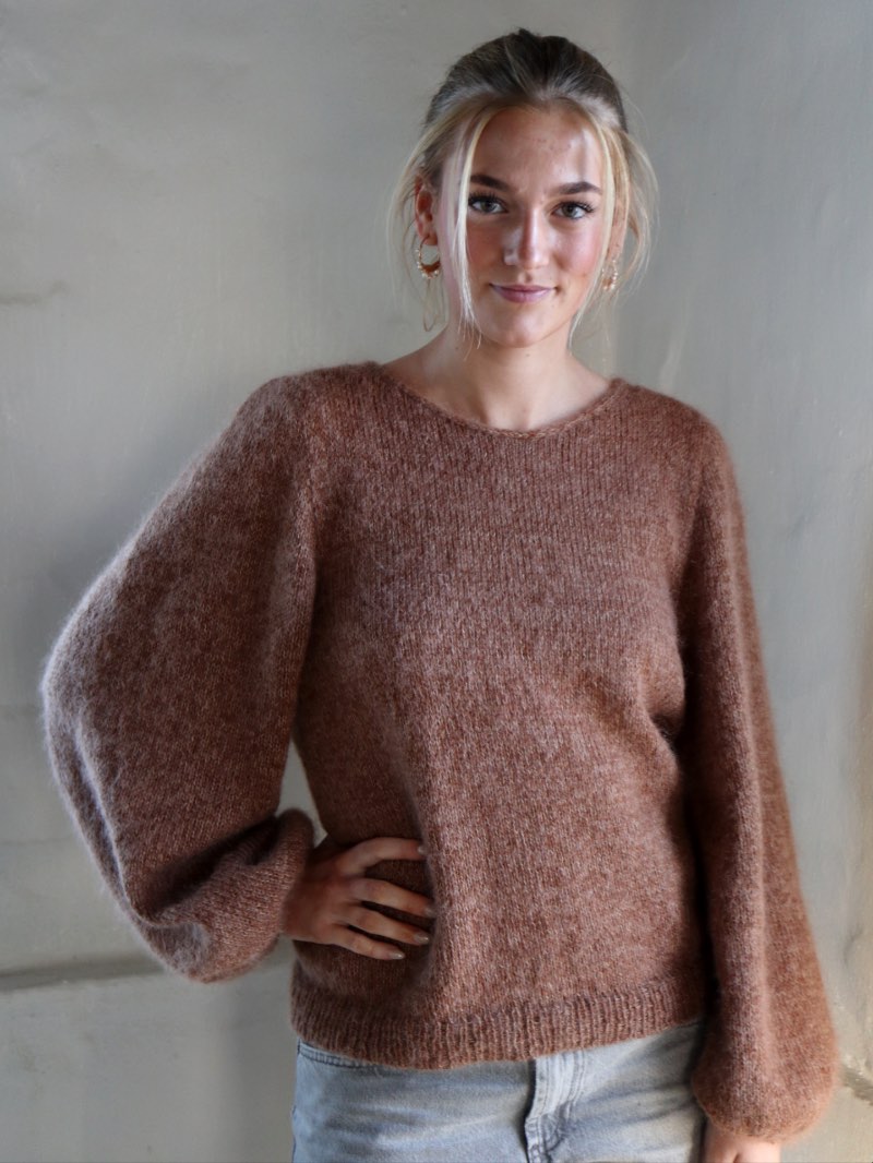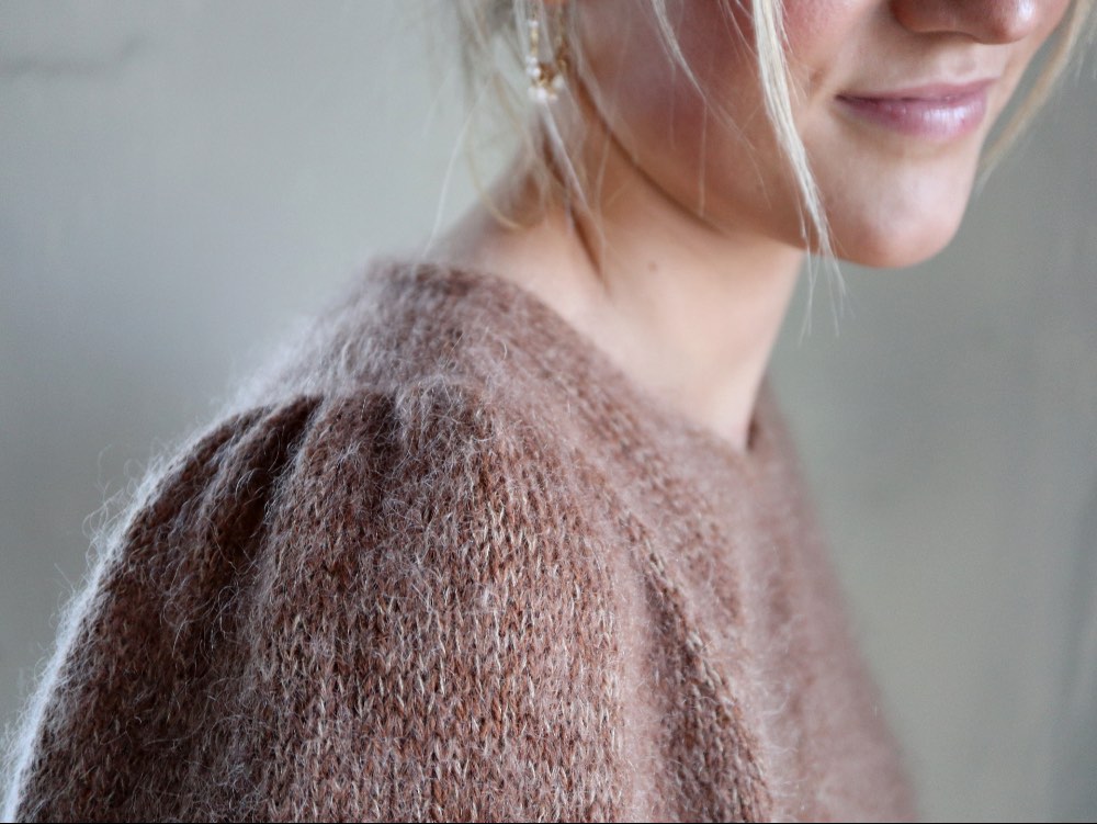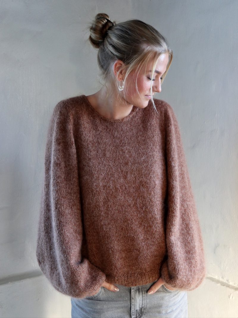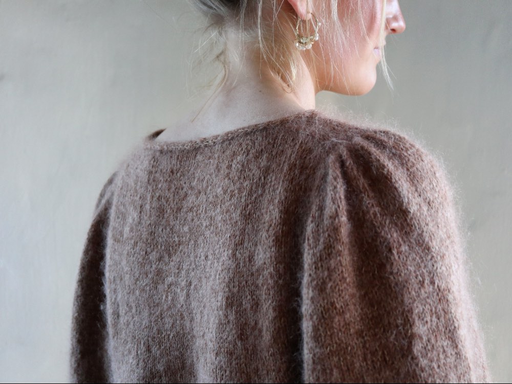 Aislin Blouse is knitted on 4.0 mm needles, with ribbing worked on 3.5 mm needles. The recommended yarn is Ellen by Permin, held together with silk mohair, such as Brushed Lace by Mohair by Canard. This yarn combination creates a light, airy fabric with a soft halo, while still offering structure and durability.
