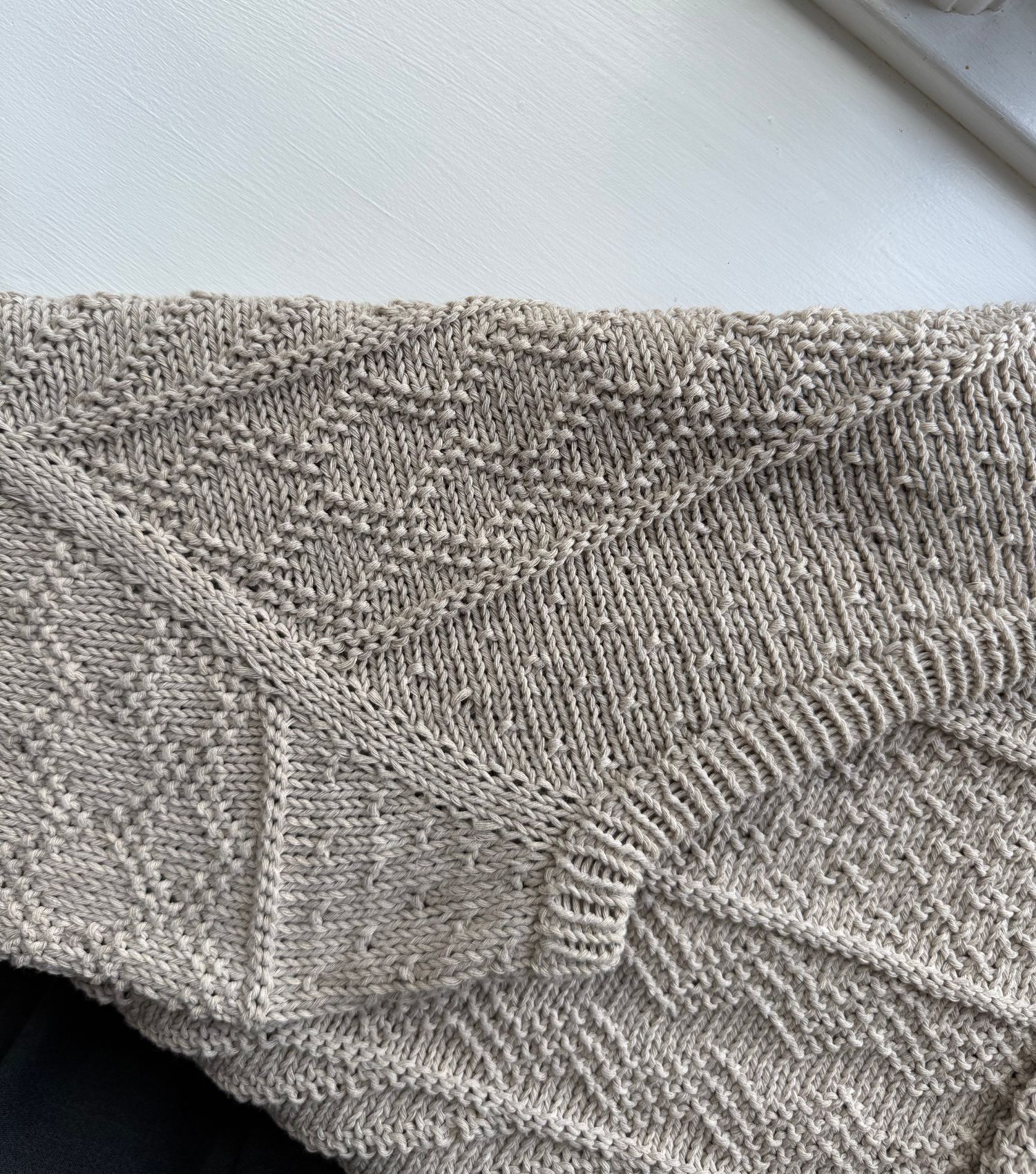 Den strikkes på pind 4 mm til strukturstrik og pind 3,5 mm til ribkanter, med en strikkefasthed på 20 masker x 32 pinde = 10 x 10 cm efter vask og blokning.