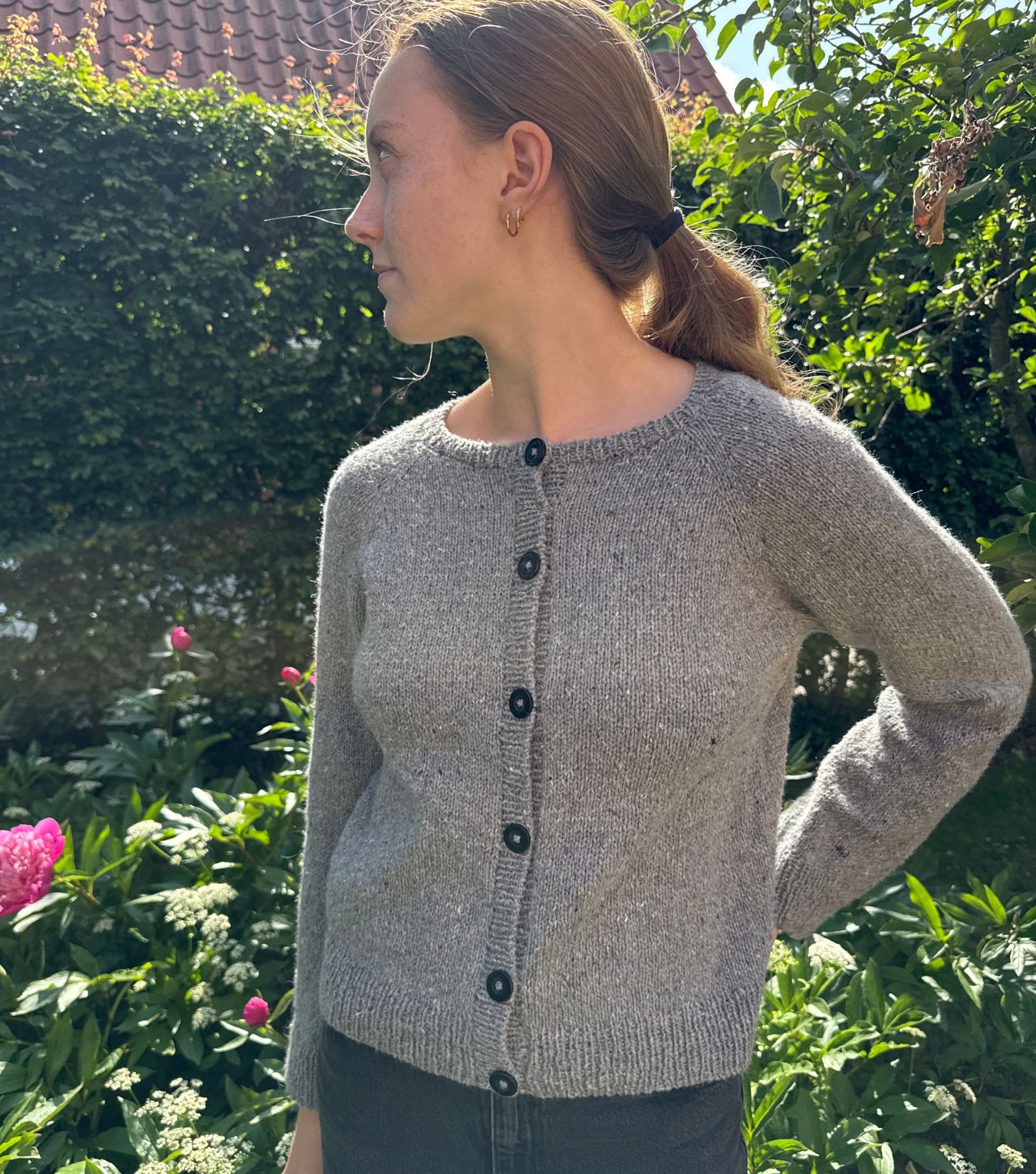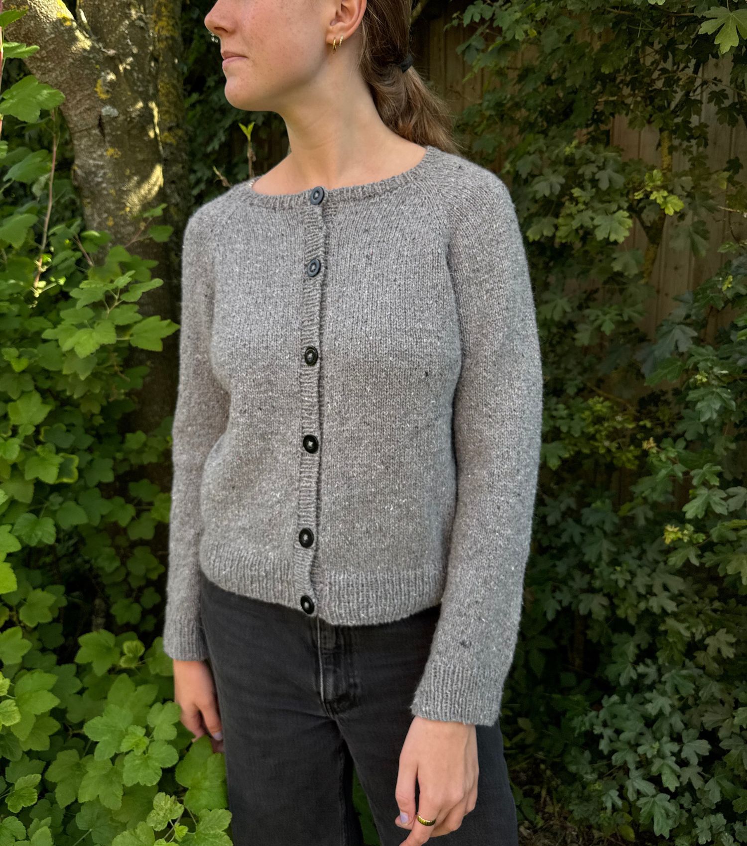 Cardiganen strikkes frem og tilbage på rundpind med raglanudtagninger, kroppen i glatstrik og ærmerne rundt. Til sidst strikkes elegante knapstolper og en fin rib i halskanten, der afsluttes med italiensk aflukning for et professionelt finish. Vejledende pinde er rundpinde 3,5 og 4 mm (40–100 cm) samt strømpepinde 3,5 og 4 mm, alt efter om du strikker magic loop eller ej. Strikkefastheden er 21 masker x 28 pinde = 10 x 10 cm i glatstrik på pind 4 mm, hvilket giver en let, men stadig lun struktur, perfekt til lag på lag.