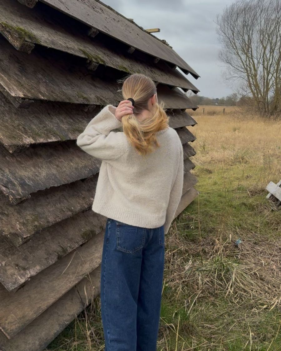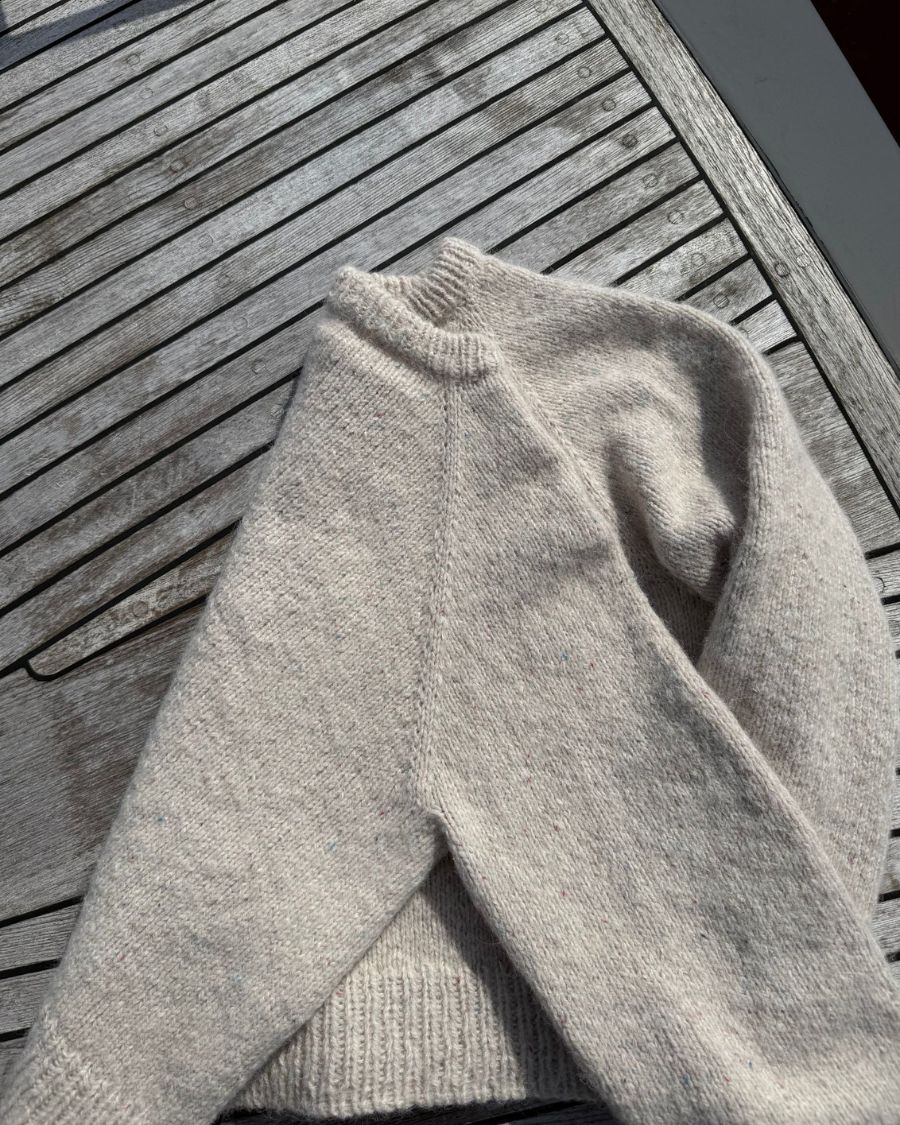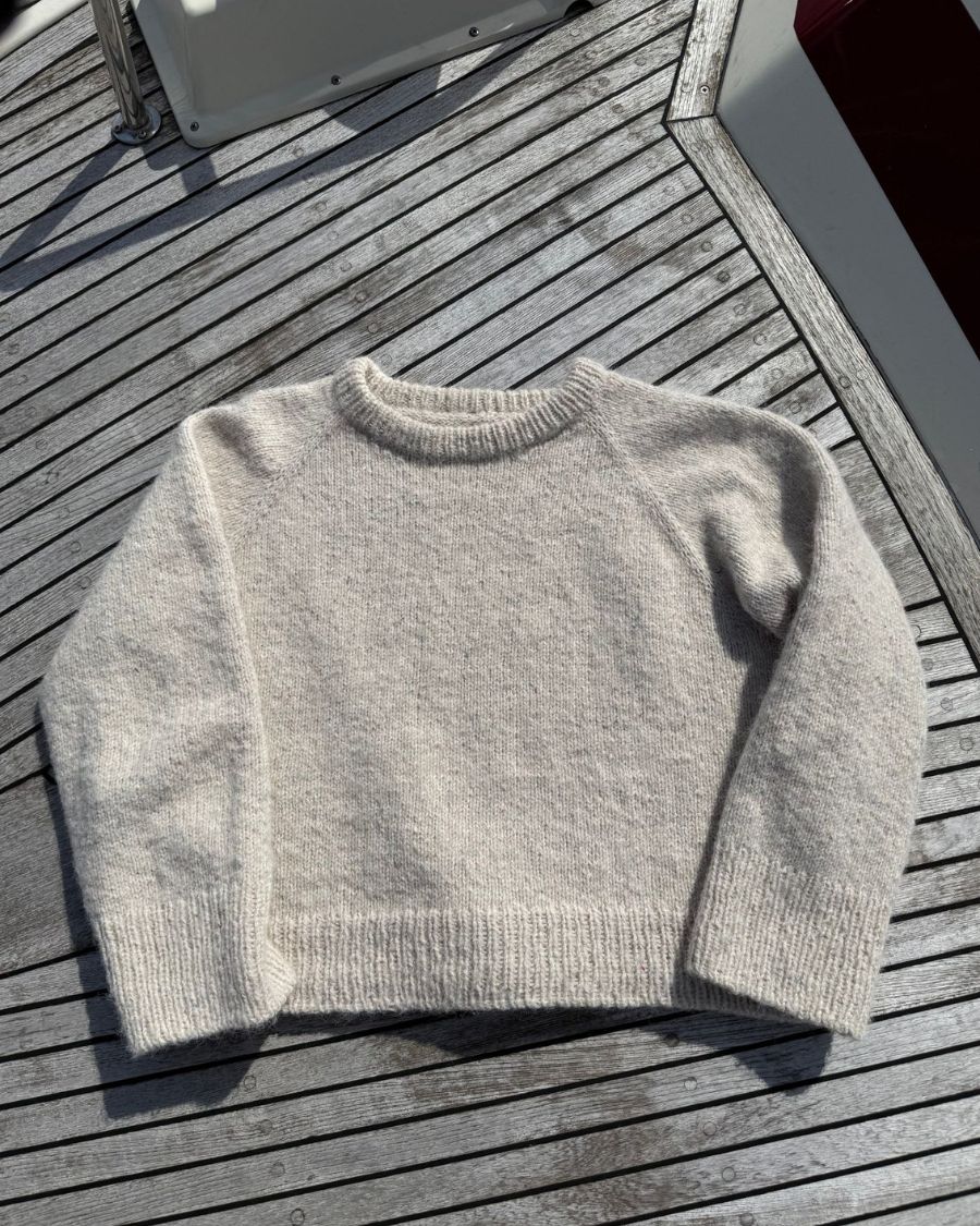 Bella Sweater er en elegant raglansweater, der strikkes oppefra og ned med vendepinde i nakken for en flot formet halsudskæring. Den strikkes i en tråd Reborn Tweed 300 og en tråd Brushed Alpaca Silk, hvilket giver et blødt og tweedet udtryk. Vejledende pinde er 3,5 mm og 4 mm – strikkefastheden er 19 masker x 26 pinde = 10 x 10 cm. Modellen har ribkanter og fås i størrelser XS–5XL. Perfekt til et stilrent og behageligt look.