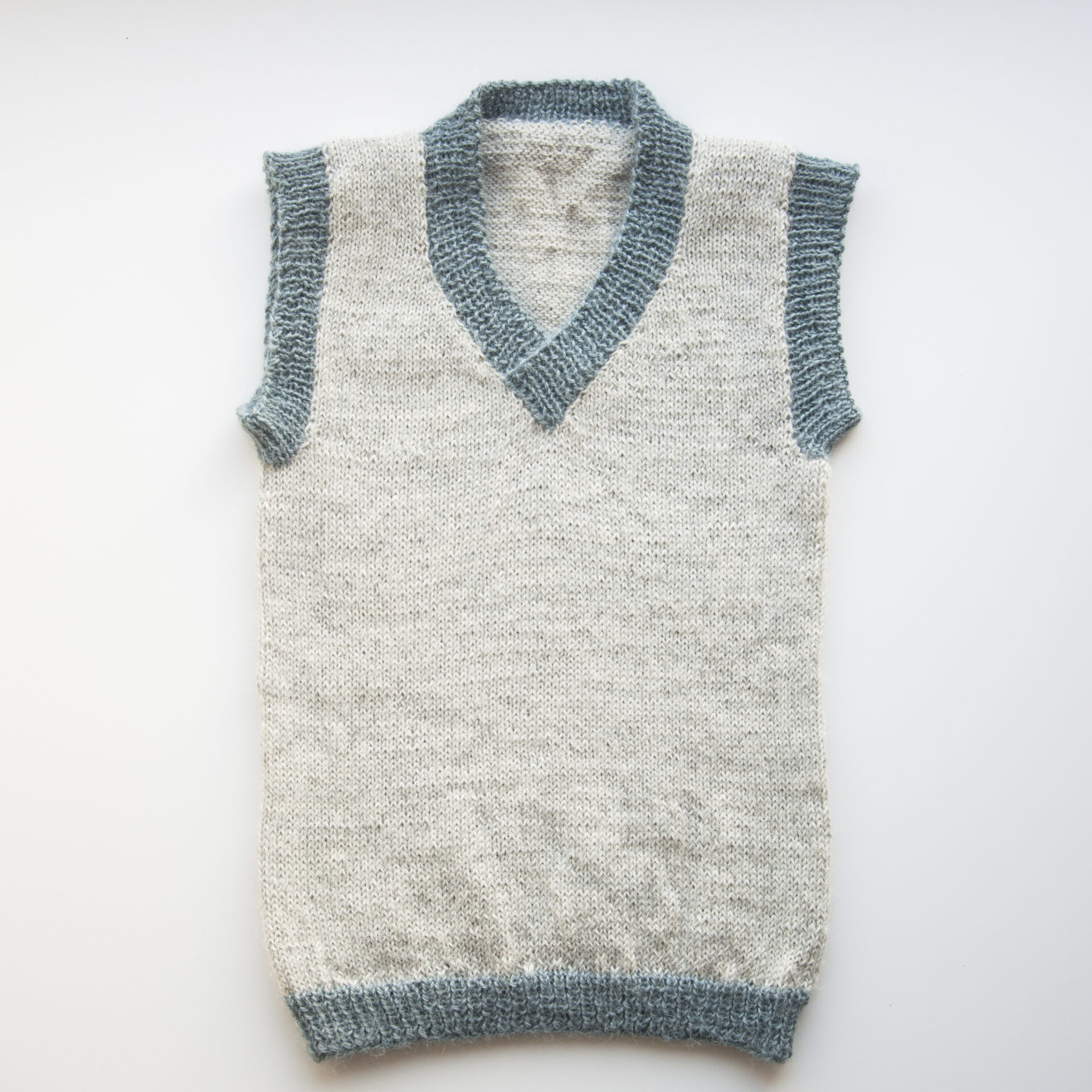 Vesten har en fin vrangbord forneden og i halskanten, og strikkes oppefra og ned med udtagninger og skuldersømme, der syes sammen fra vrangsiden. Ærmer og halskant afsluttes med rib og giver et pænt og færdigt udtryk.