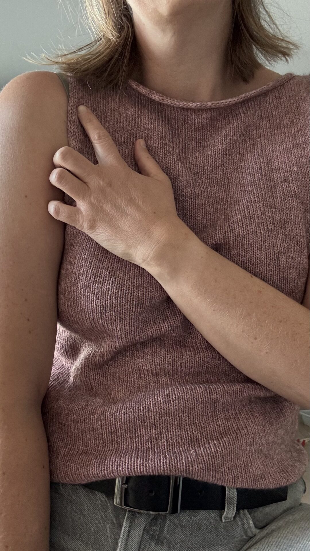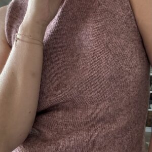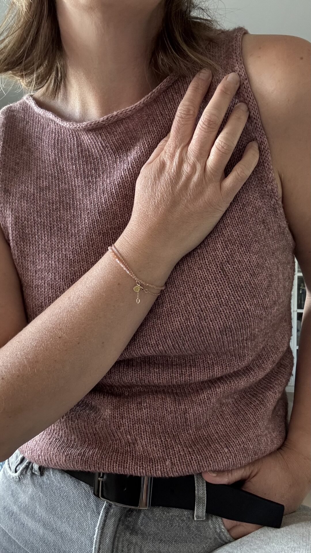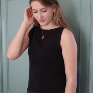 Black Night Top (garnpakke) fra Knitamore er en elegant og tidløs top, hvor garnet virkelig får lov at skinne. Toppen strikkes oppefra og ned i glatstrik med stilrene i-cord-kanter i hals, ærmegab og bund. Den høje bådudskæring og den tætsiddende, skræddersyede pasform skaber et feminint og moderne udtryk, der gør toppen perfekt både til hverdagsbrug og mere formelle lejligheder.