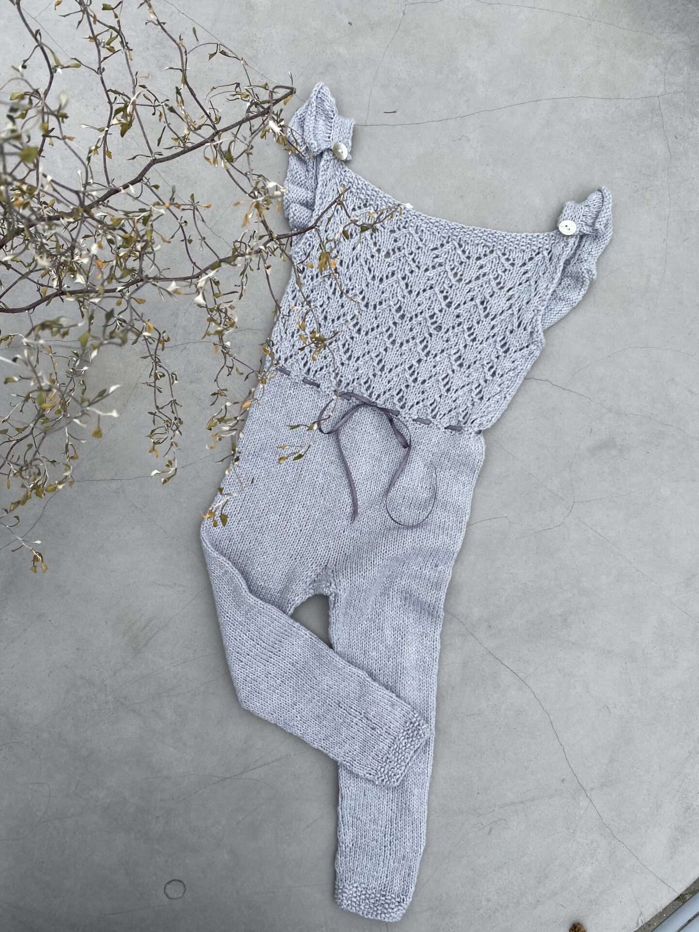 Elinas Buksedragt fra Kracun Knitwear er en skøn strikket buksedragt til de mindste i familien. Formålet med dragten er at sidde tæt til kroppen. Udtrykket af dragten kan varieres ved hjælp af det bindebånd, der placeres midt på dragten. Valget af bånd kan give dragten forskellige udseender, eller det kan helt undlades. Du begynder din strikning nedefra og bevæger dig opad. Vejledningen inkluderer både en version med lange ben og en sommervariant med korte ben.