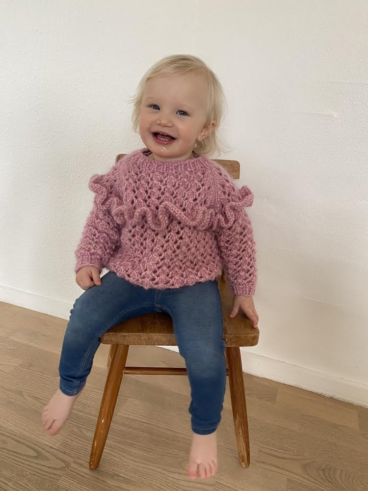 Hindbær Sweater Junior fra Kracun Knitwear er en strikket sweater med fine detaljer. Sweateren findes også i en My Size udgave.
