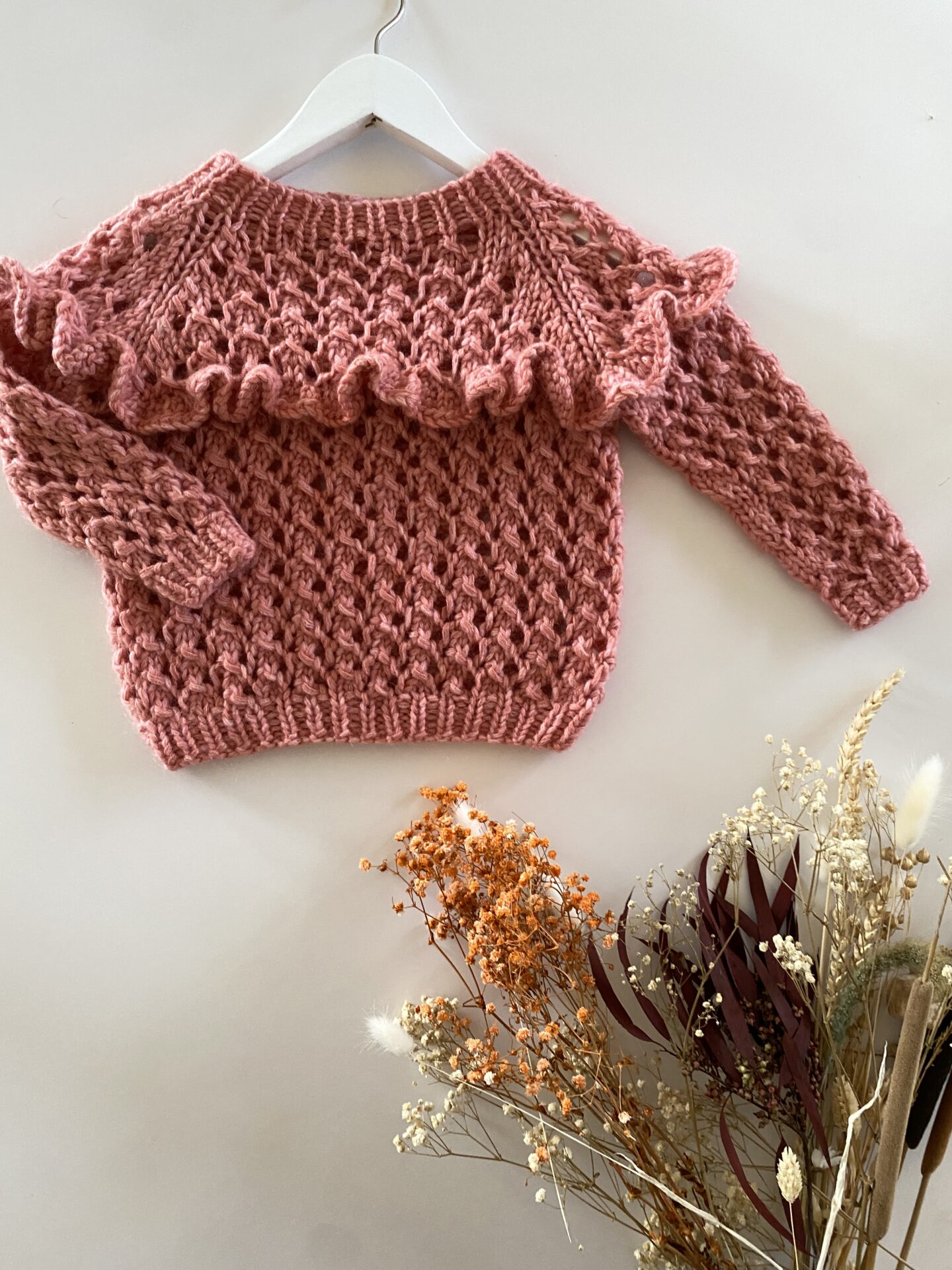 Hindbær Sweater Junior fra Kracun Knitwear er en tyk og simpel strikket sweater. Den her et let hulmønster og en smuk flæsekant på bærestykket. Den strikkes rundt nedefra og op. Hulmønsteret er let at mestre med et brugervenligt diagram. Perfekt for nybegyndere, der ønsker at udforske hulmønsterteknikken. Ærmerne smelter elegant sammen med kroppen takket være raglanindtagninger på bærestykket. Afslutningsvis tilføjer flæsekanten en fin detalje, strikket til sidst ved at samle masker op langs bærestykket