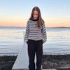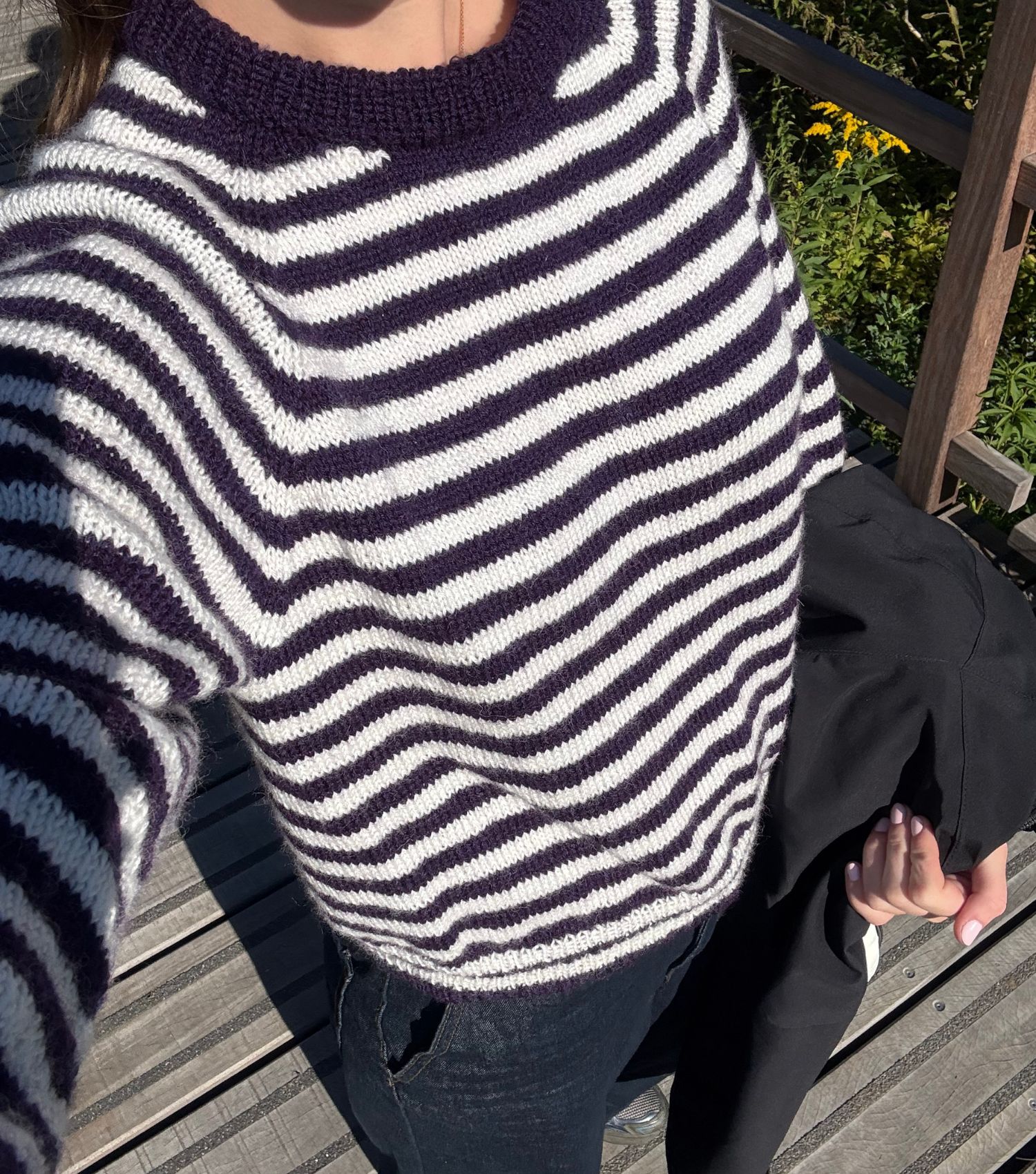 Ingeborg Sweater af Anna Hamann Axelsen fra Axelknit er en smuk, stribet sweater strikket oppefra og ned på pind 4 mm i glatstrik. Den strikkes i to farver i MAYFLOWER ANYDAY Merry, et blødt garn med en løbelængde på 150 m pr. 50 g. Sweateren formes med raglanudtagninger og vendepinde i nakken, der giver en behagelig og gennemført pasform. Halskanten strikkes ned, så den ligger perfekt mod kroppen, og både krop og ærmer afsluttes med ribkanter, der lukkes af med en elastisk italiensk aflukning. Modellen har et bevægelsesrum på 10–15 cm og findes i størrelser fra XXS til 5XL, hvilket gør den egnet til mange kropsformer. Et klassisk, tidløst design til dig, der elsker striber og en flot pasform.