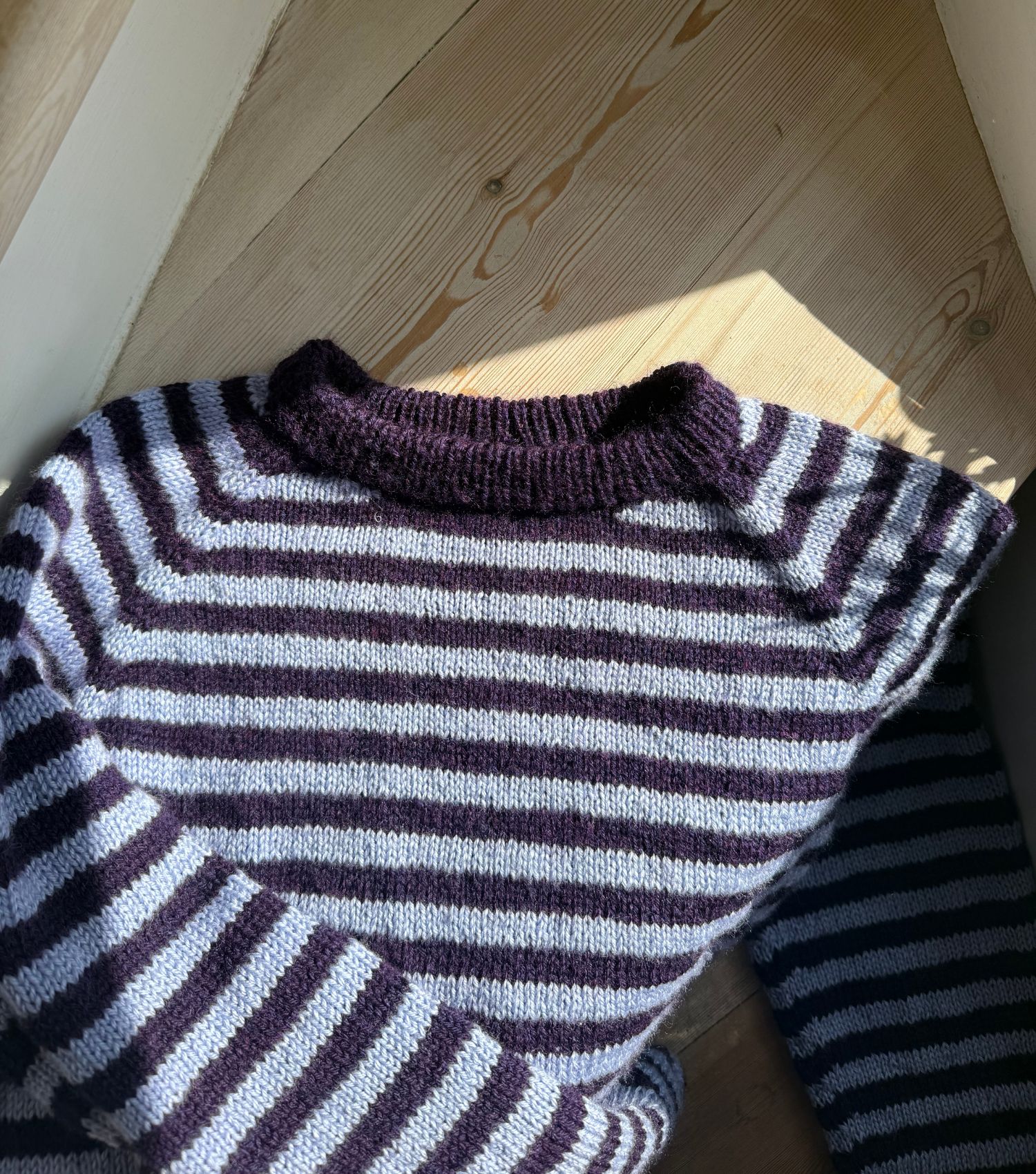 Når bærestykket er strikket, sættes ærmemaskerne til hvile, og kroppen fortsættes i glatstrik med striber, der skaber et flot helhedsudtryk. Den strikkes i rundstrik, hvilket giver en ensartet struktur og et blødt fald. Kroppen afsluttes med ribkanter i begge farver, der bindes sammen med en elegant italiensk aflukning, som giver en smuk og elastisk afslutning.