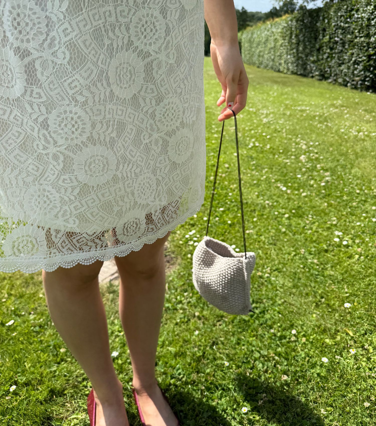 Tasken færdiggøres med to lædersnøre á ca. 1 meter, der trækkes igennem hver sin løbegang, så enderne mødes i bunden og bindes i en knude. Dette giver tasken et enkelt og eksklusivt look og gør den nem at åbne og lukke.