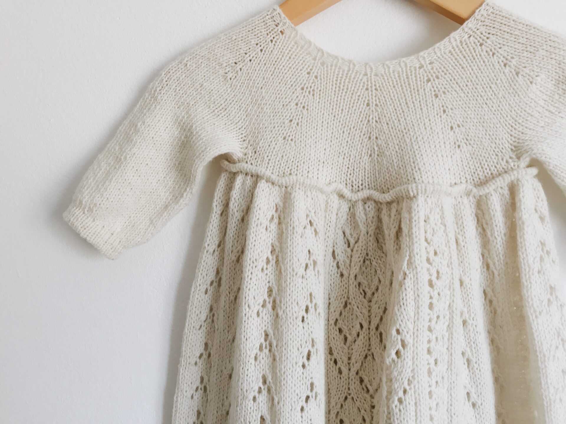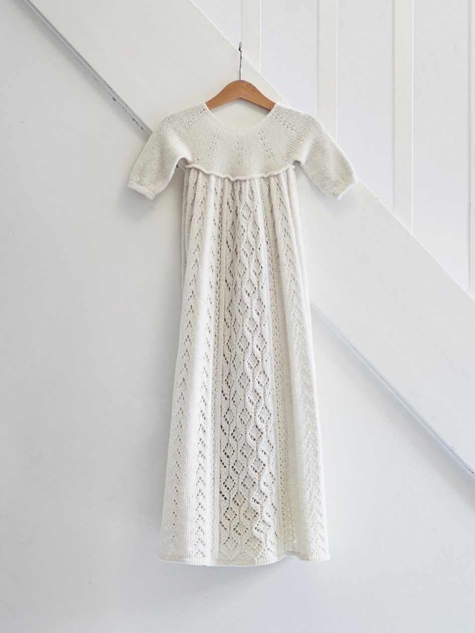 Karens Dåbskjole fra Notperfectknit er en smuk, enkel og detaljeret strikket dåbskjole.