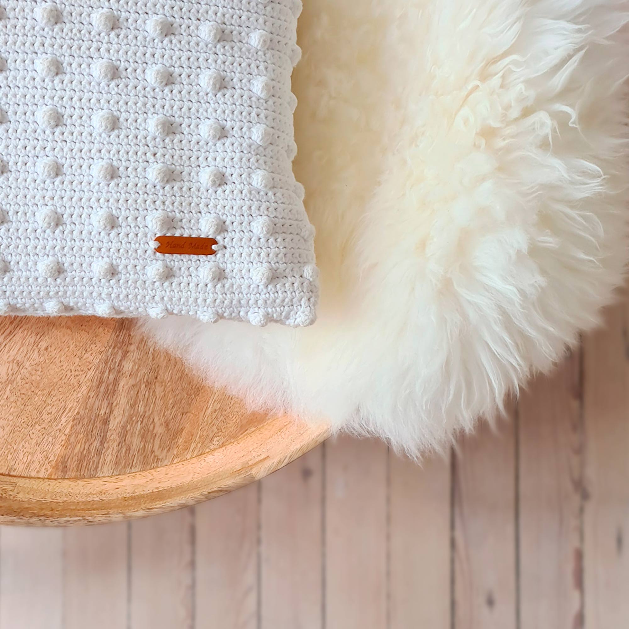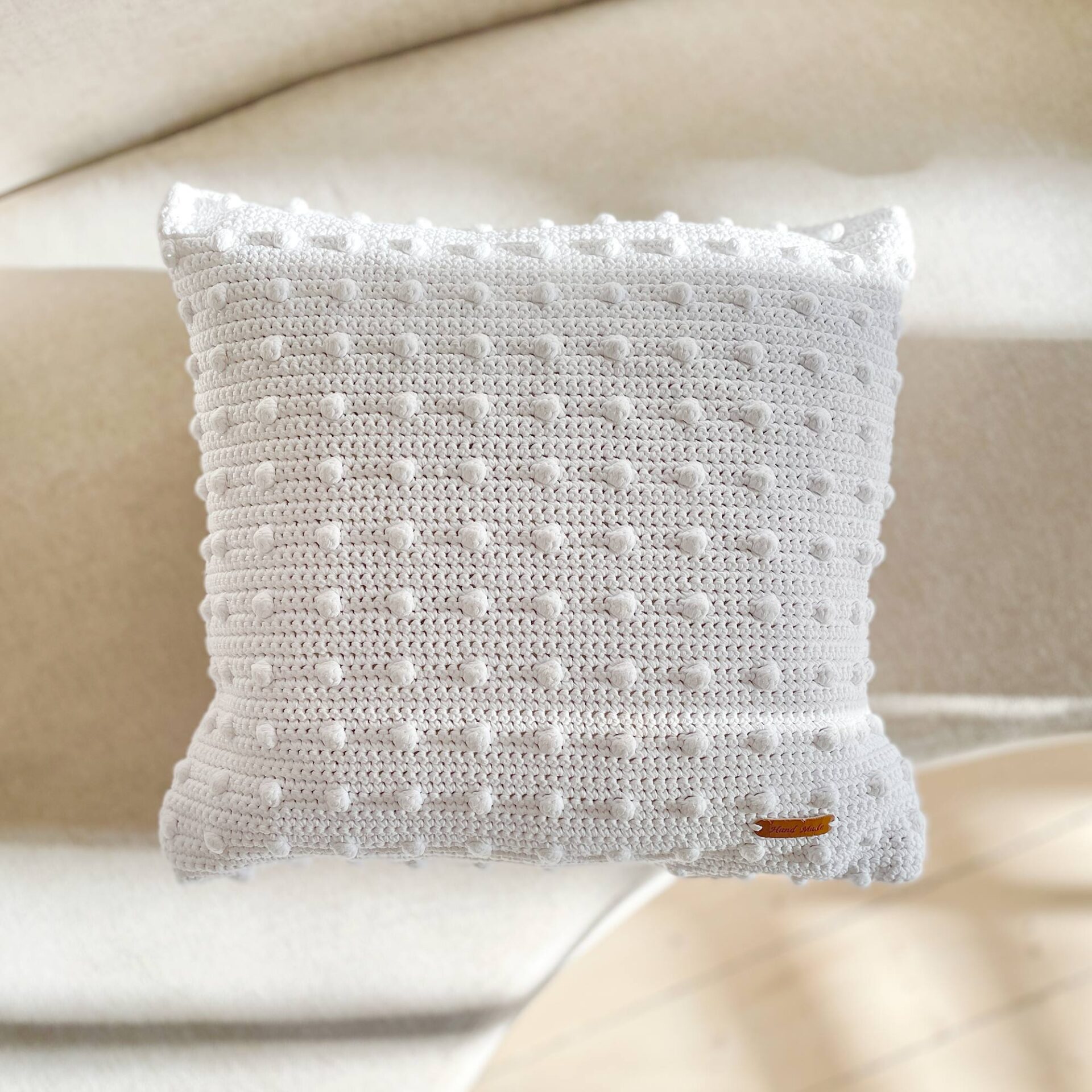 Malene Boblepude af Milla Billa er er et dejligt pudebetræk med et 13 x 13 boblemønster gennem. Kun forsiden hækles bobler på, og bagsiden hækles i fine luftmaskekæde. Til sidst stykkerne hækles sammen og lynlås monteres.