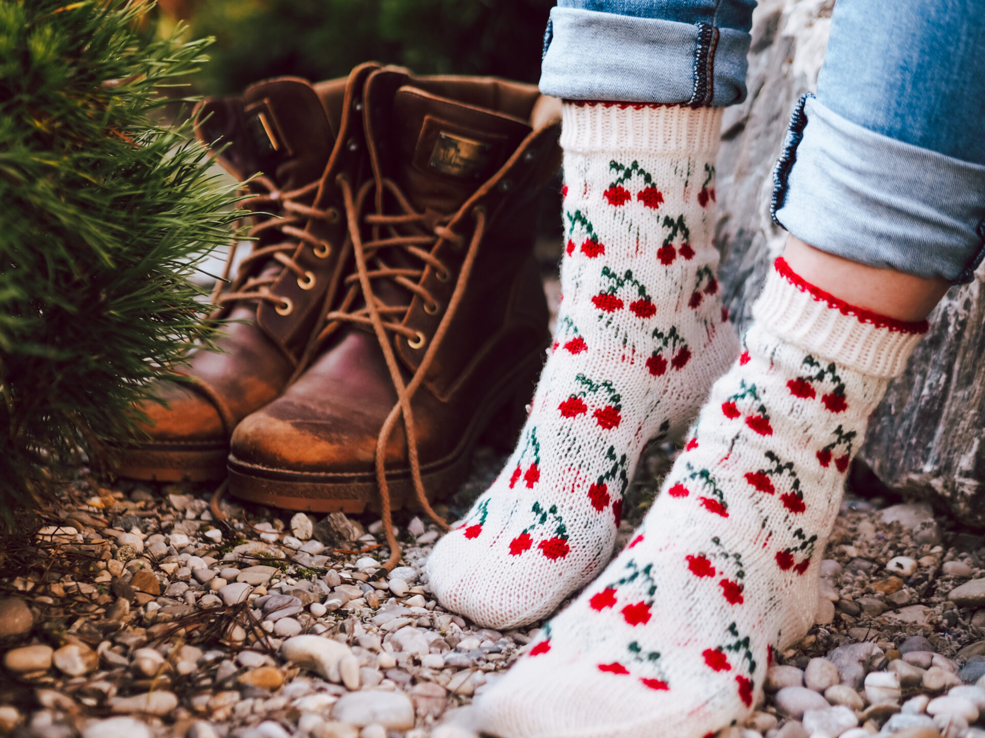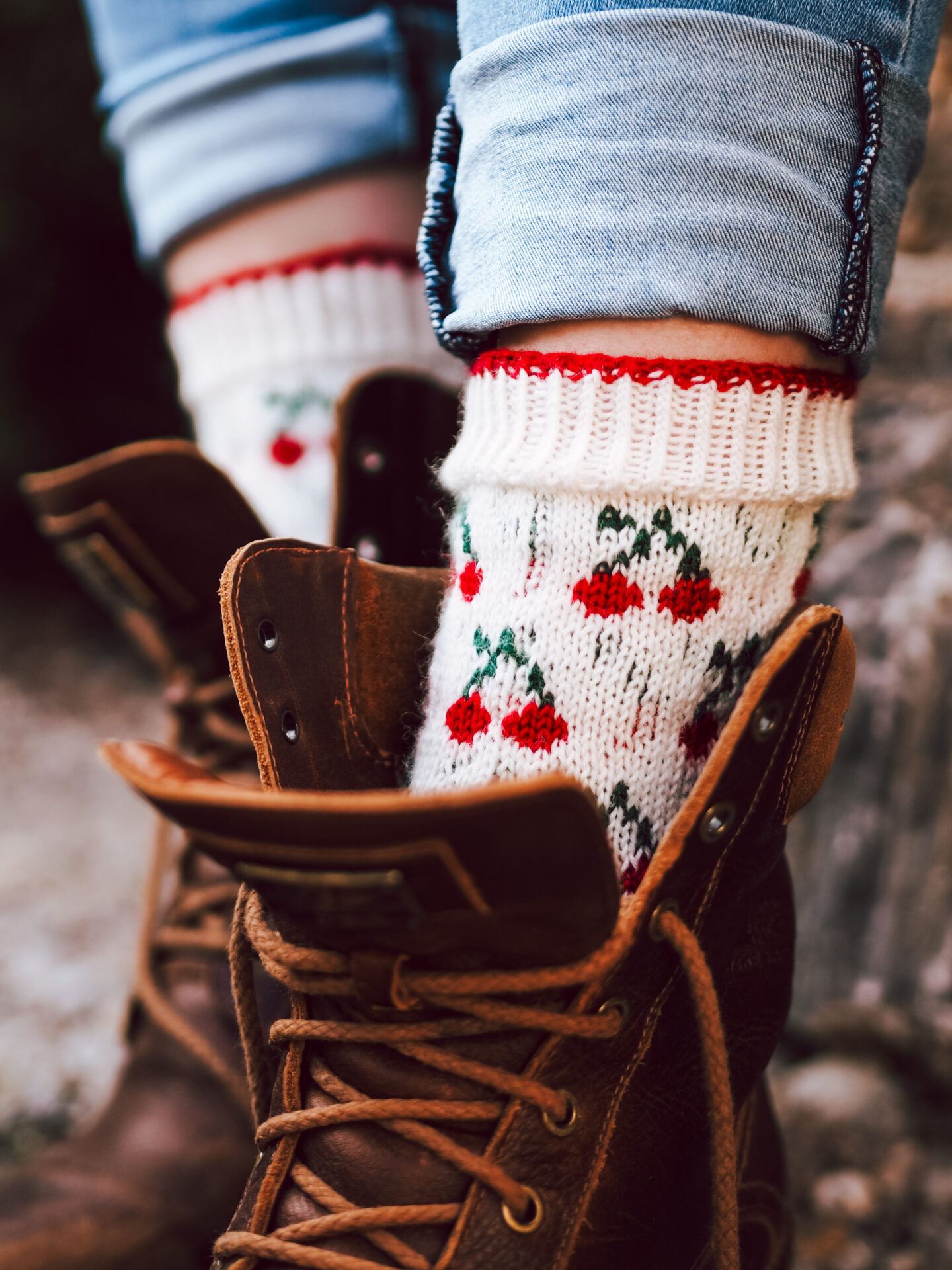 Marilyn Socks are a bold and playful sock design created by designer Miriam Walchshäusl, also known as Mrs Funny Valentine. Inspired by Marilyn Monroe’s iconic presence, cherry-red lipstick and unapologetic confidence, this design combines classic sock construction with a cheerful Fair Isle cherry motif. The result is a pair of socks full of personality, charm and vintage-inspired flair.