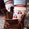 The Marilyn Socks are knit from the top down, starting with an elastic cast-on and a twisted rib cuff. A subtle pop of contrasting color at the cuff adds a refined decorative detail before the main colorwork begins. The repeating cherry Fair Isle pattern runs across both the leg and the foot, creating a cohesive and eye-catching design that feels both fun and timeless.