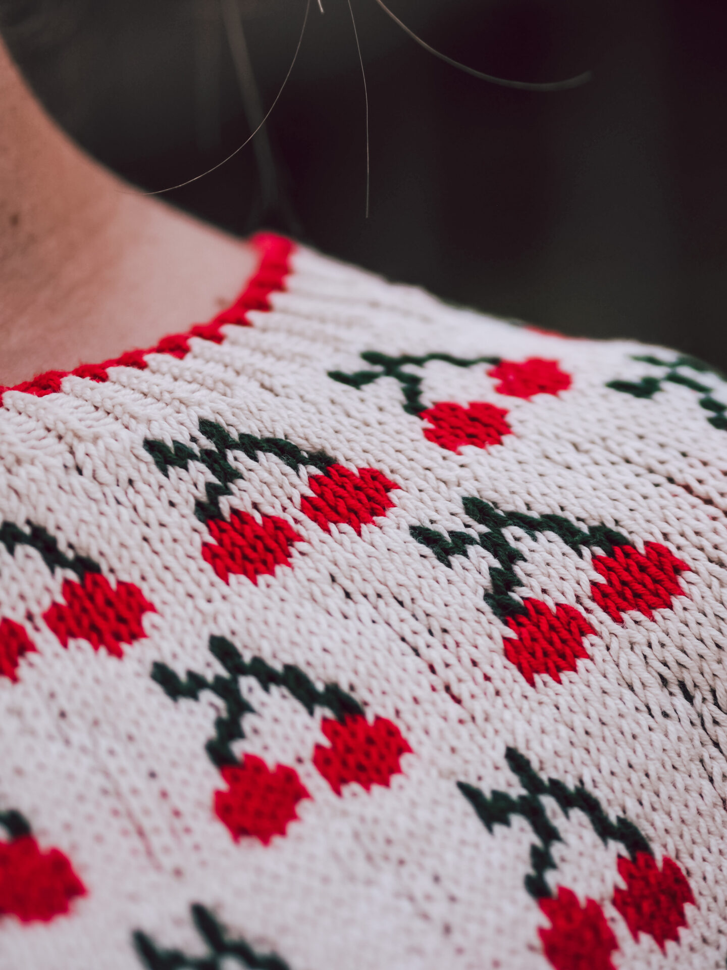 Marilyn Tee is a bold and playful knitted top designed by Miriam Walchshäusl, also known as Mrs Funny Valentine. Inspired by Marilyn Monroe’s iconic style, confidence and unapologetic attitude, this design celebrates femininity with a strong visual statement. The all-over cherry Fair Isle pattern instantly evokes vintage glamour and carefree summer vibes, making Marilyn Tee a true eye-catcher.