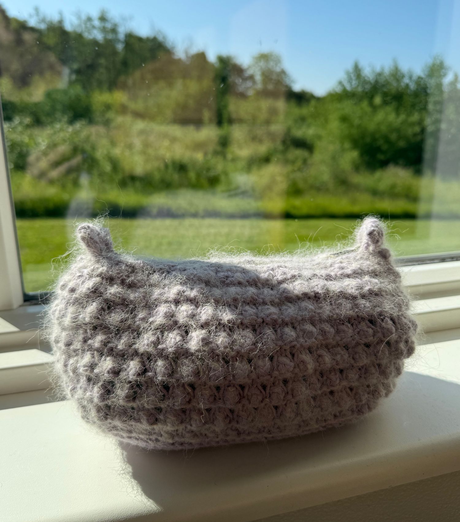 The base is knitted in double knitting, creating a firm and stable foundation. Stitches are then picked up along all edges and worked in the round using the bubble stitch pattern. This stitch gives the clutch its signature plush texture and makes it both visually appealing and pleasant to hold.