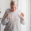 Der Sweater wird nahtlos von oben nach unten mit Raglan-Zunahmen gestrickt. Du beginnst mit einem Rippenbündchen am Halsausschnitt, gefolgt von Zunahmen an der Passe, während das markante Vorderteilmuster – bestehend aus einem Zopf nach rechts, einem Muschelmuster und einem Zopf nach links – eingearbeitet wird. Danach wird der Körper mit Seiten-Perlmuster fortgesetzt, bevor ein Rippenabschluss den Sweater stilvoll abrundet.