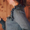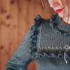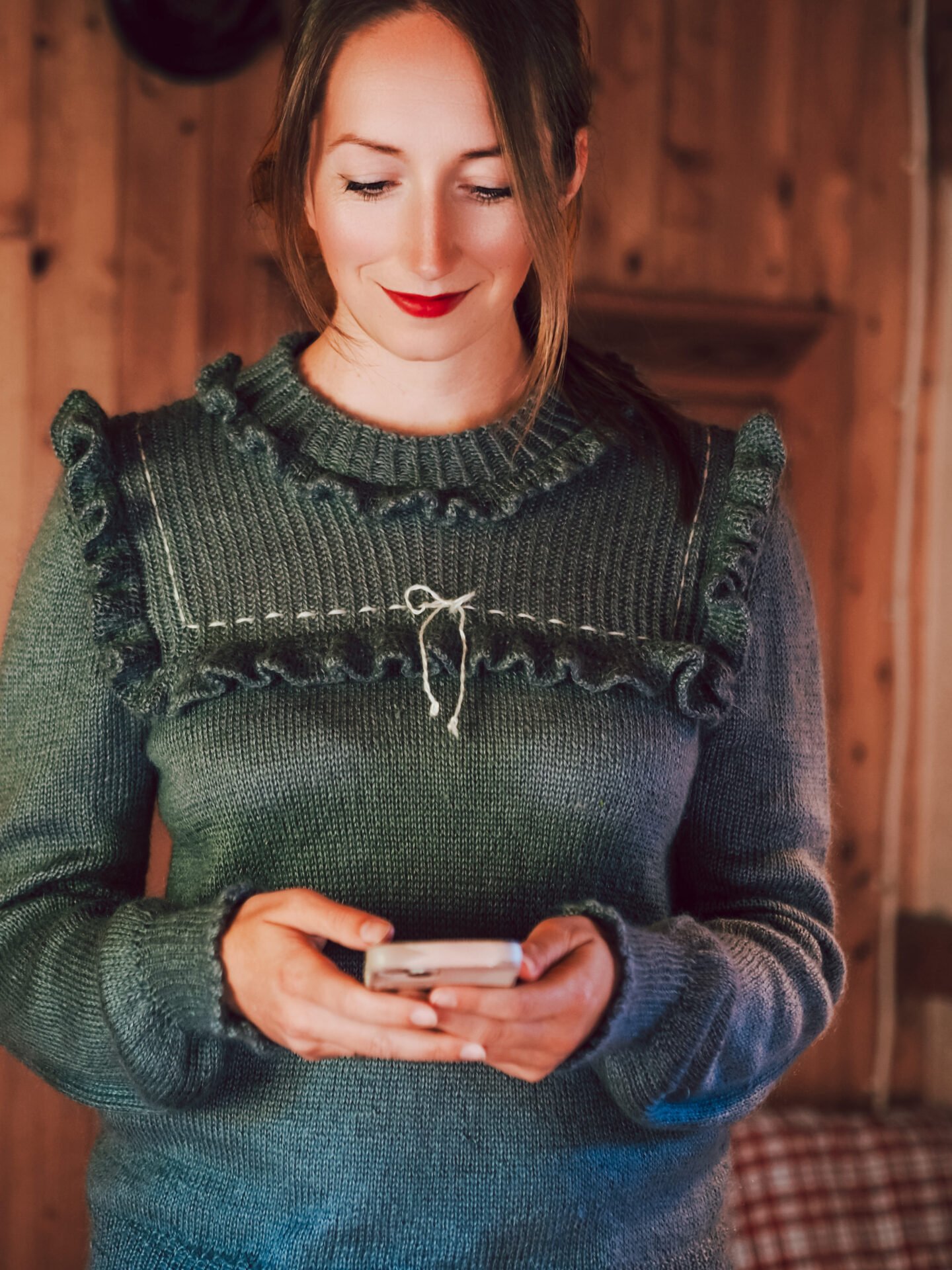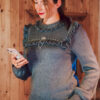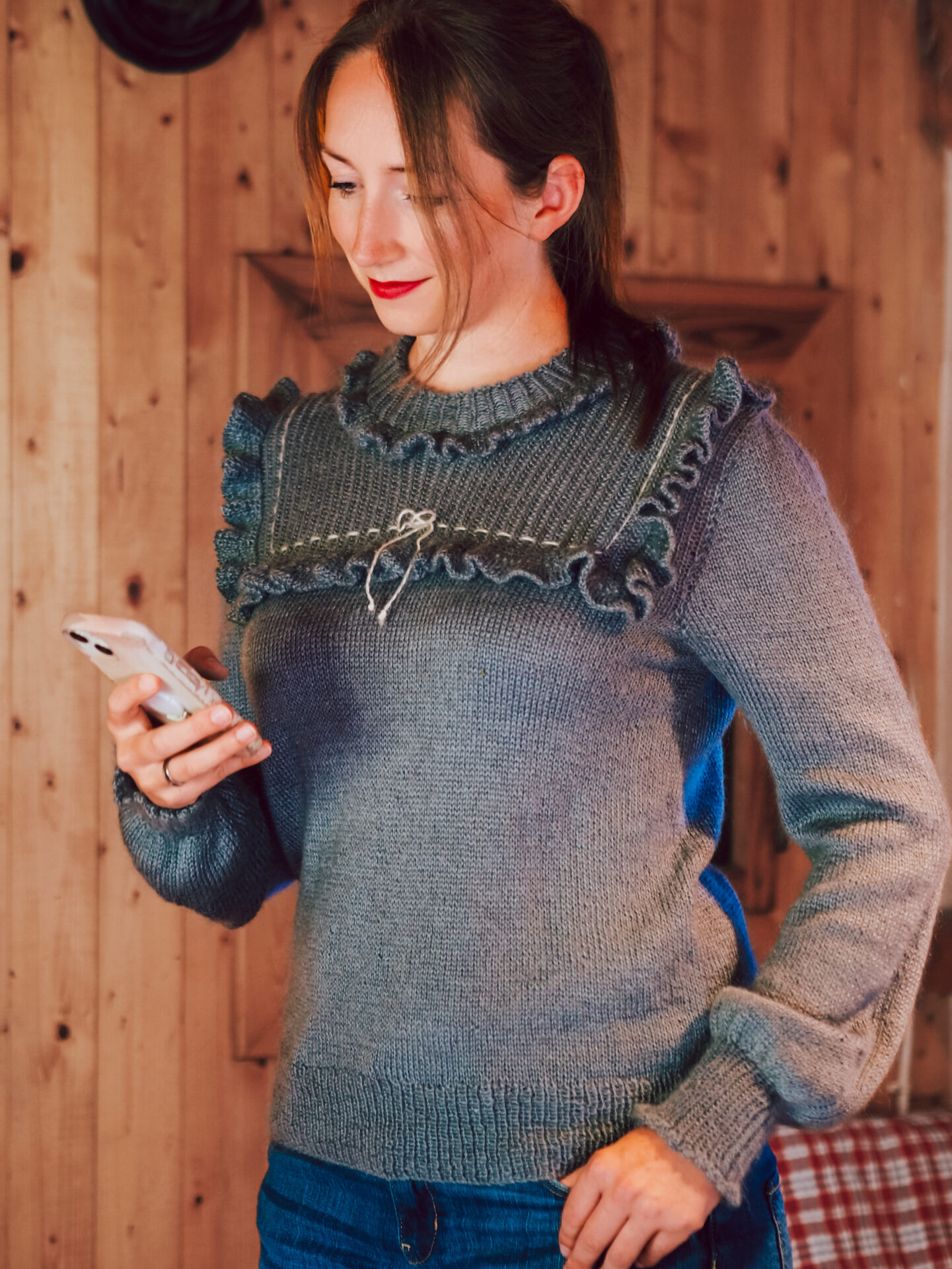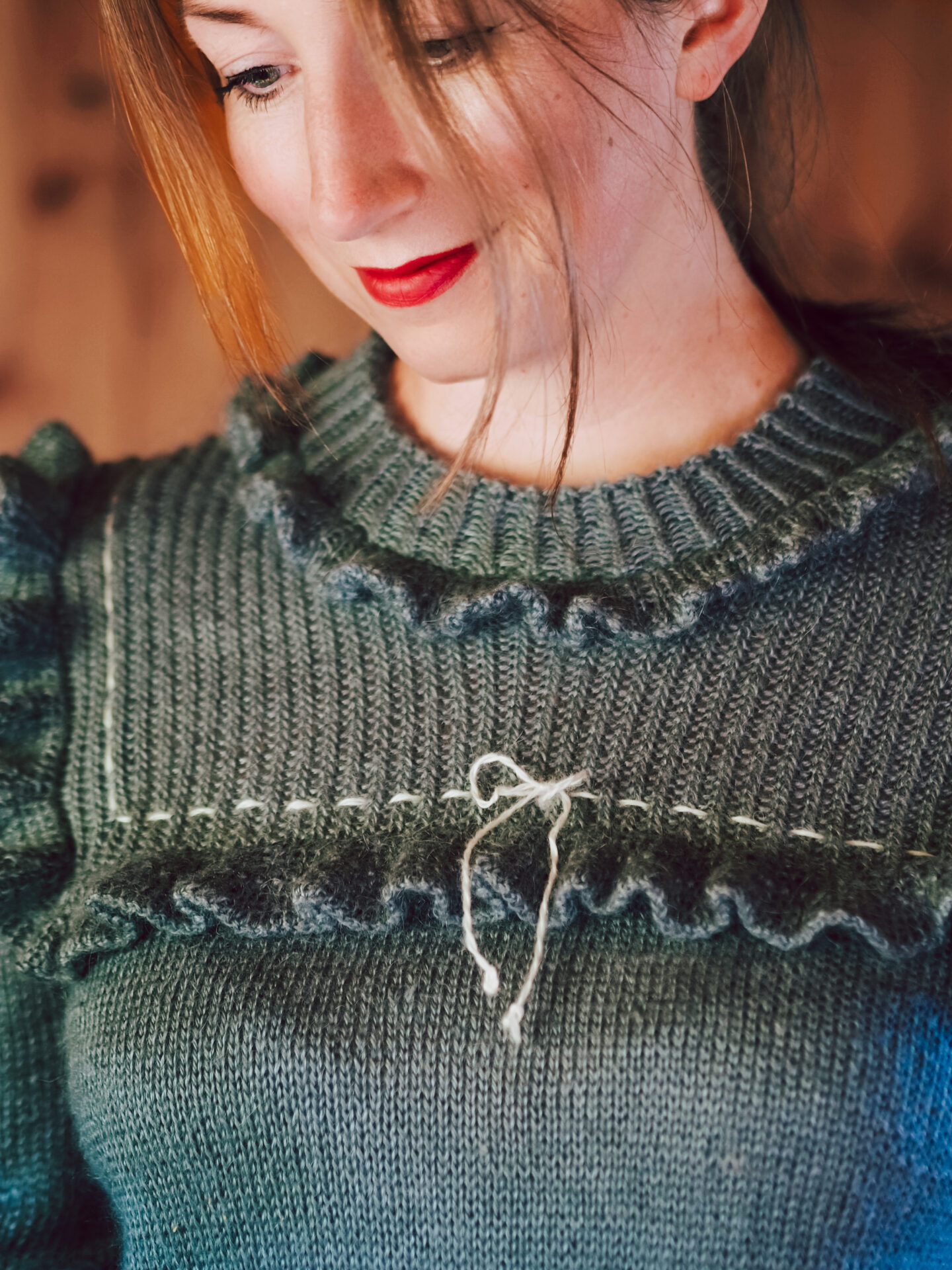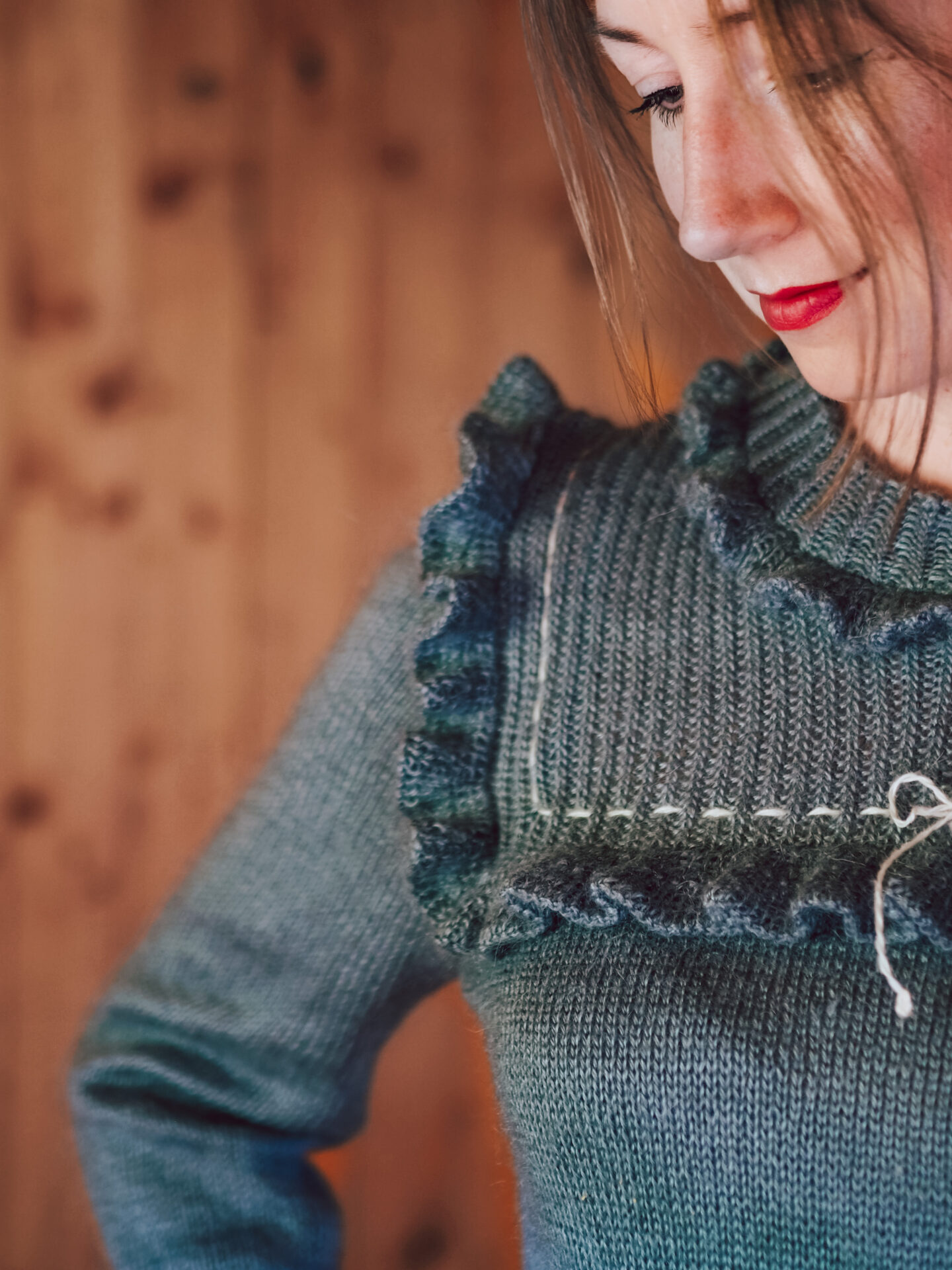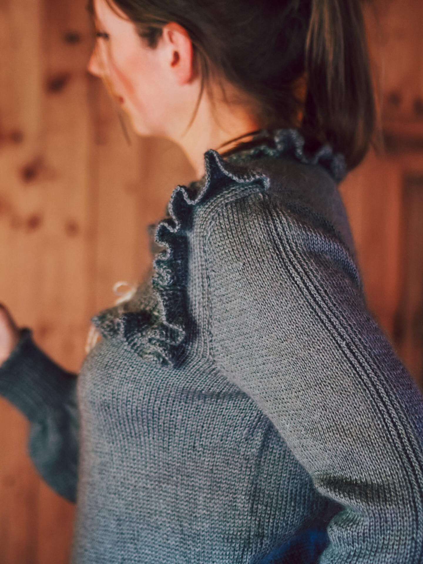 A distinctive design feature is the decorative frill that runs across the chest and around the neckline. This frill is worked separately by picking up stitches and shaping them with generous increases, creating volume and movement. The neckline is finished with a ribbed neckband that is folded and sewn down on the inside for a polished and comfortable finish.