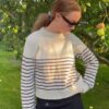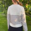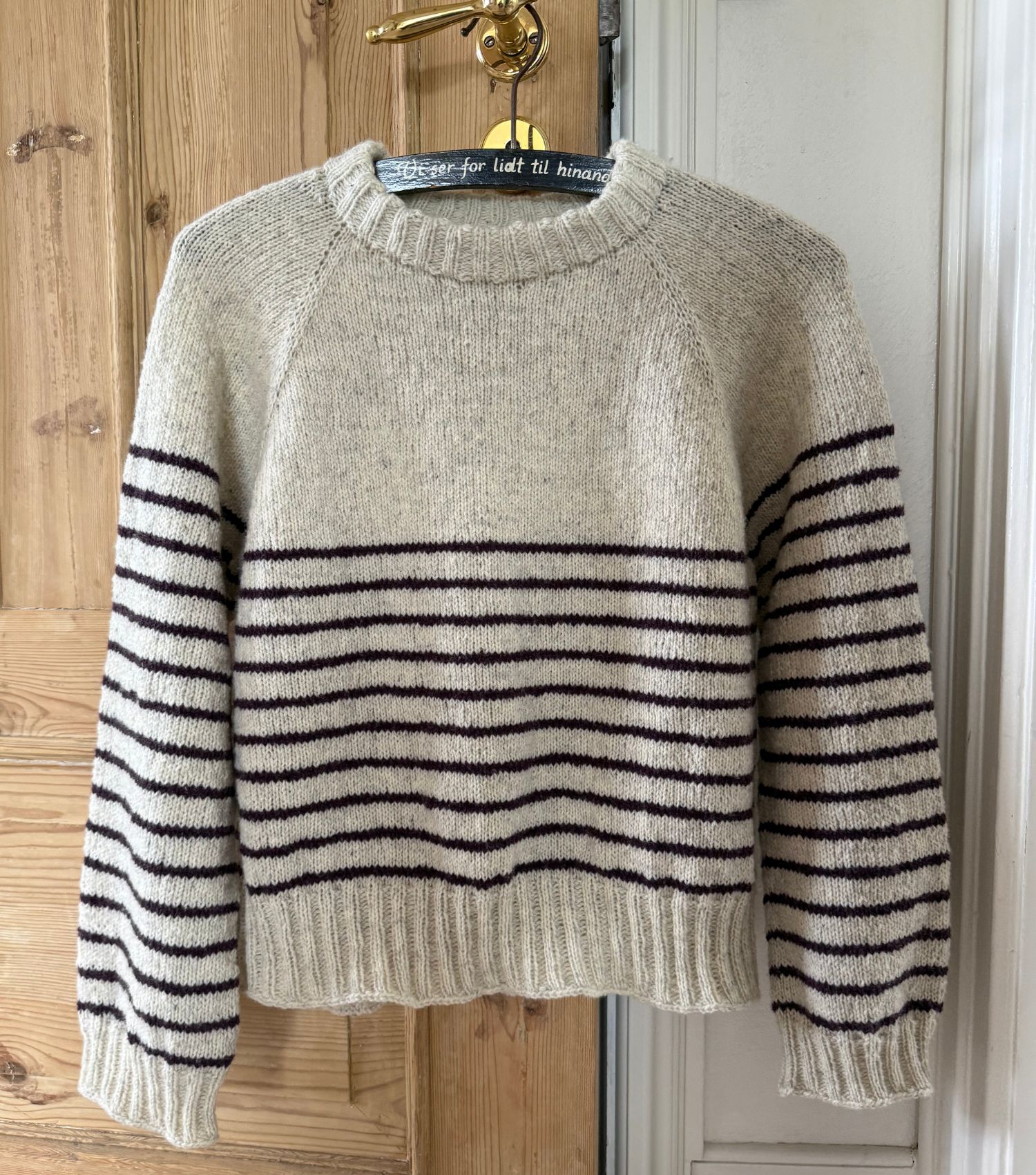 2 omgange i stribefarve efterfulgt af 6 omgange i bundfarve. Sweateren får dermed et klassisk, minimalistisk look. Længden varierer fra