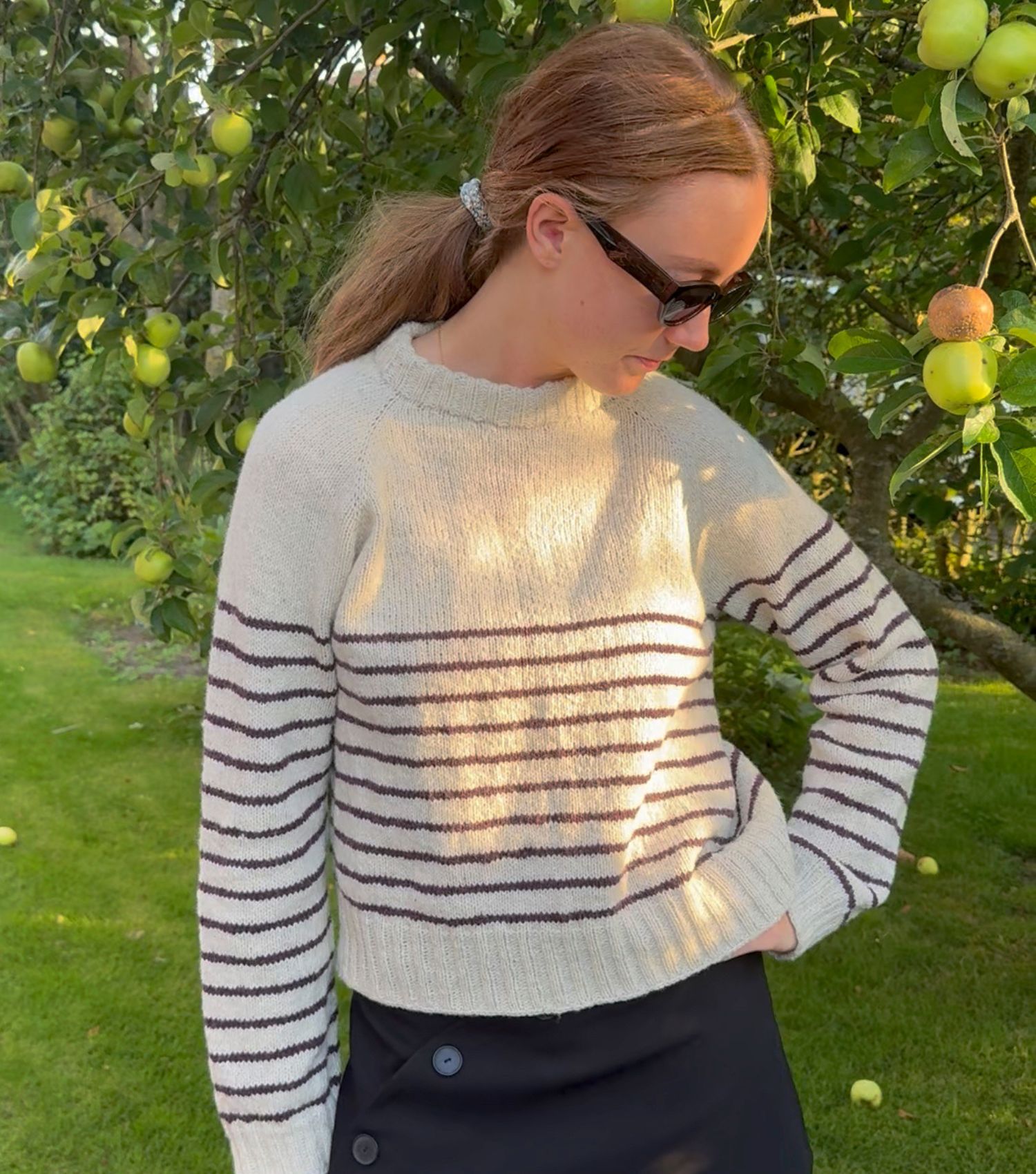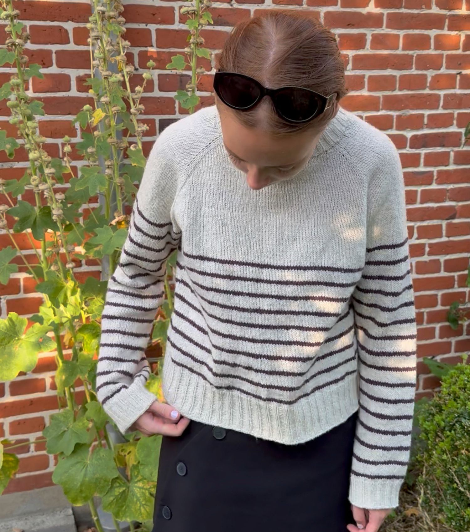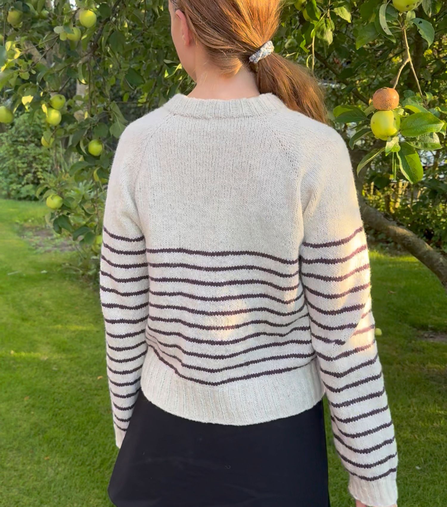 Ærmerne strikkes rundt i samme stribestruktur og formes med jævne indtagninger for en balanceret pasform. Afslutningsvis samles hele sweateren med flotte dobbeltribkanter, som giver et rent og moderne udtryk.