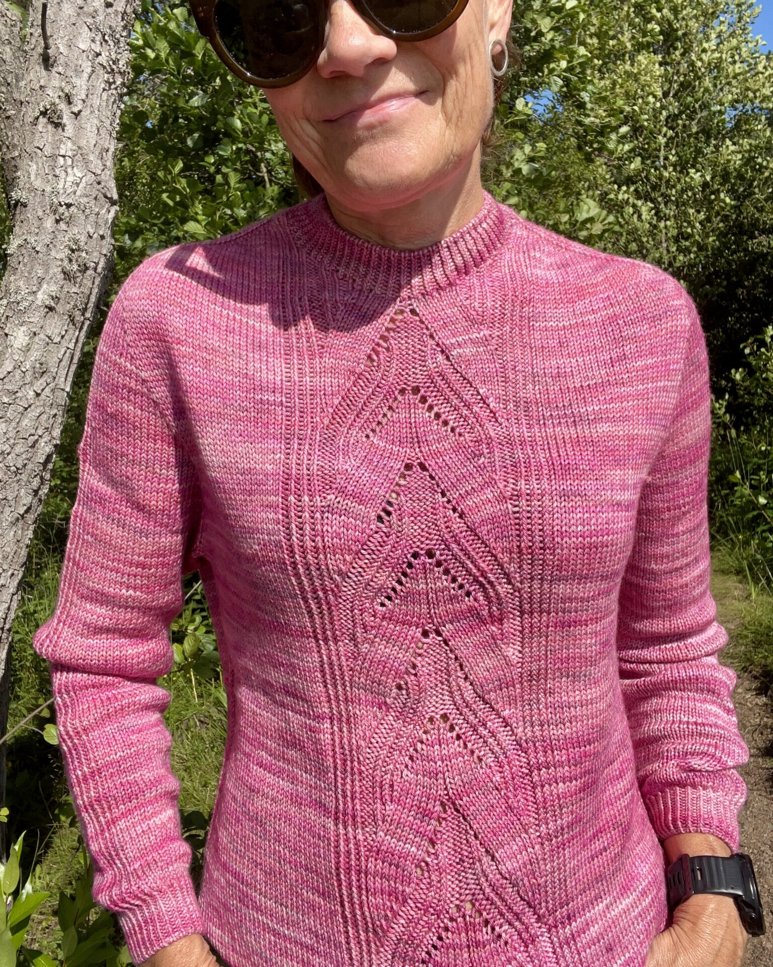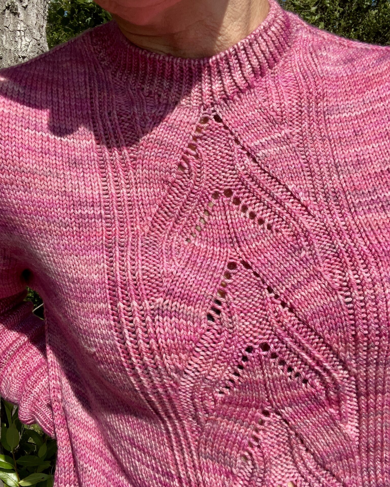 Designet strikkes i Malabrigo Arroyo, et blødt og farverigt merinogarn med en løbelængde på ca. 153 meter pr. 50 gram. Garnforbruget er 400 (400) 500 (500) 500 gram i størrelserne S (M) L (XL) 2XL. I størrelse 2XL kan der være behov for 600 gram, hvis du ønsker længere ærmer eller krop. Garnet fremhæver hulmønsteret smukt og giver en let, behagelig sweater med et pænt fald.