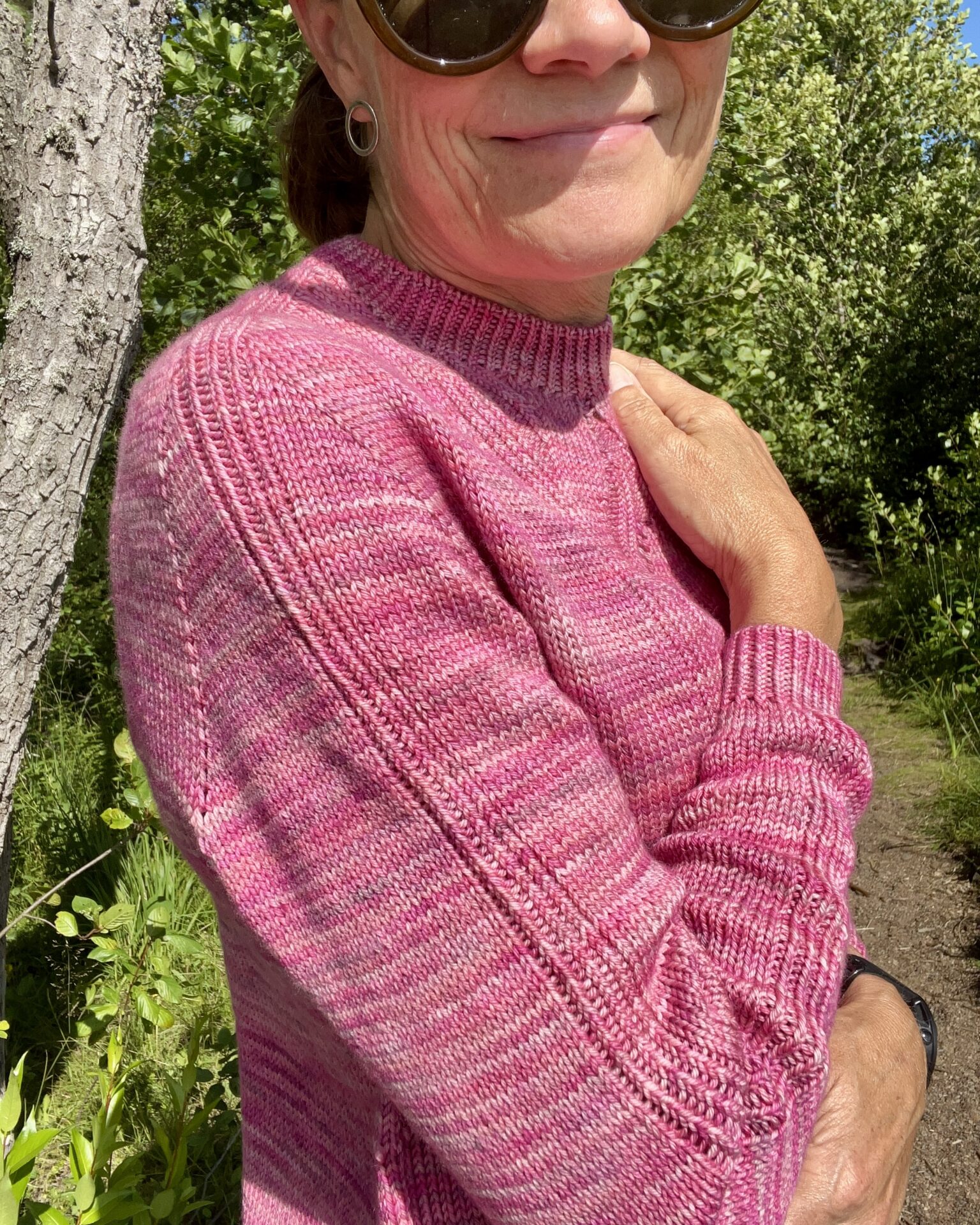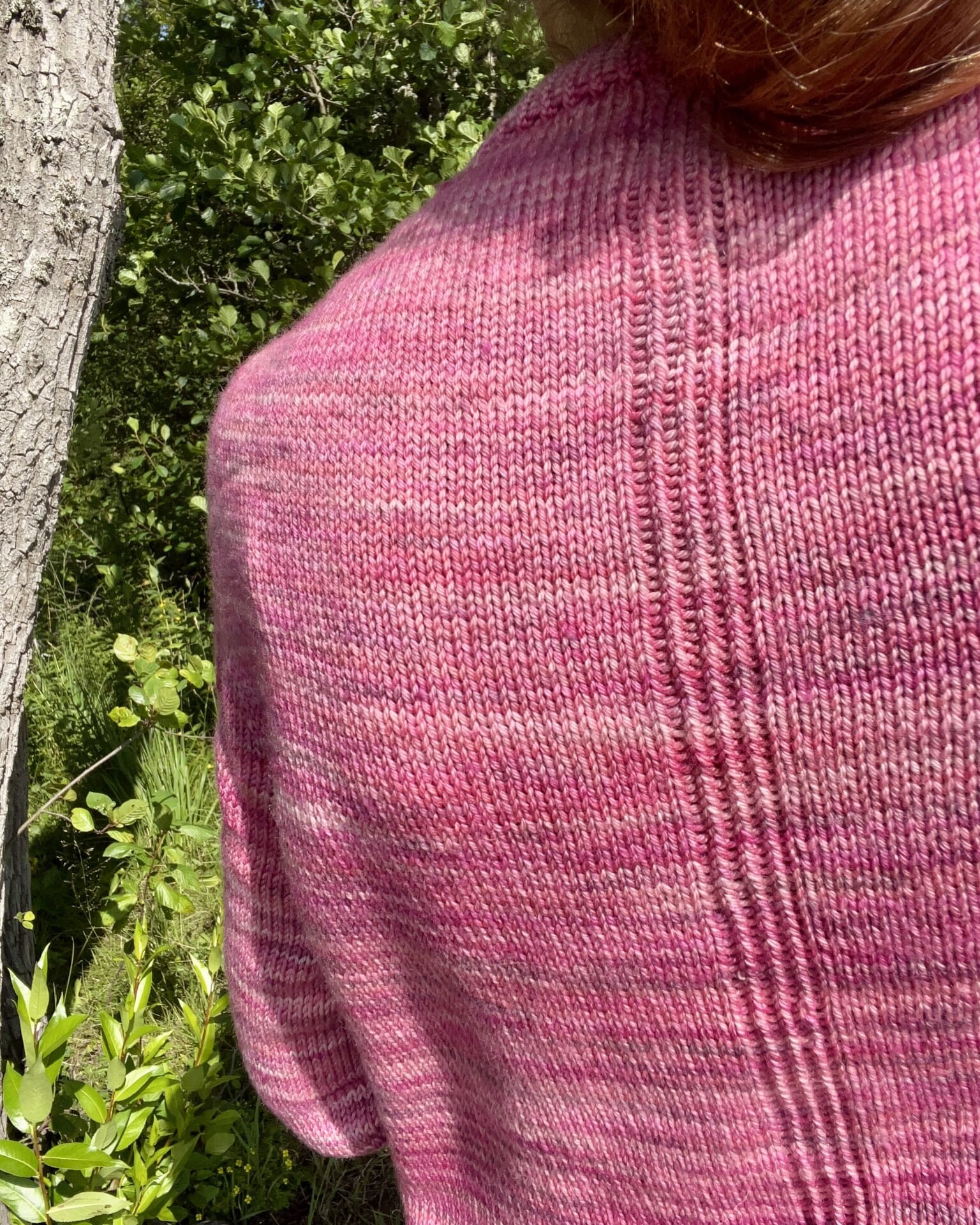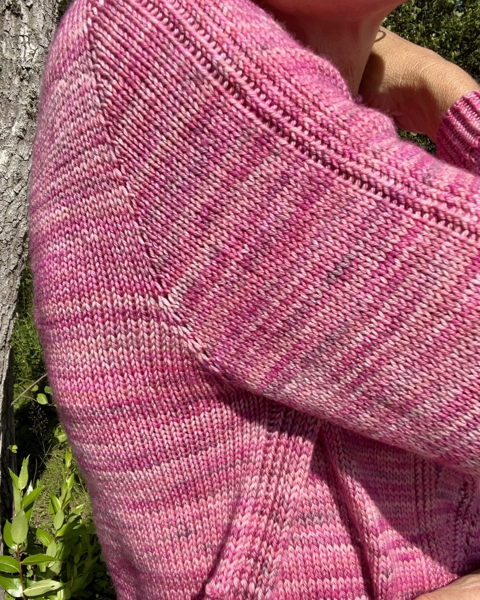 Sweateren kommer i størrelserne S (M) L (XL) 2XL med en overvidde på 90 (100) 110 (120) 130 cm og en længde på 62 (65) 66 (66) 67 cm. Modellen sidder let løst uden at være oversize, og fordi den strikkes oppefra og ned, kan pasformen let justeres undervejs.