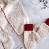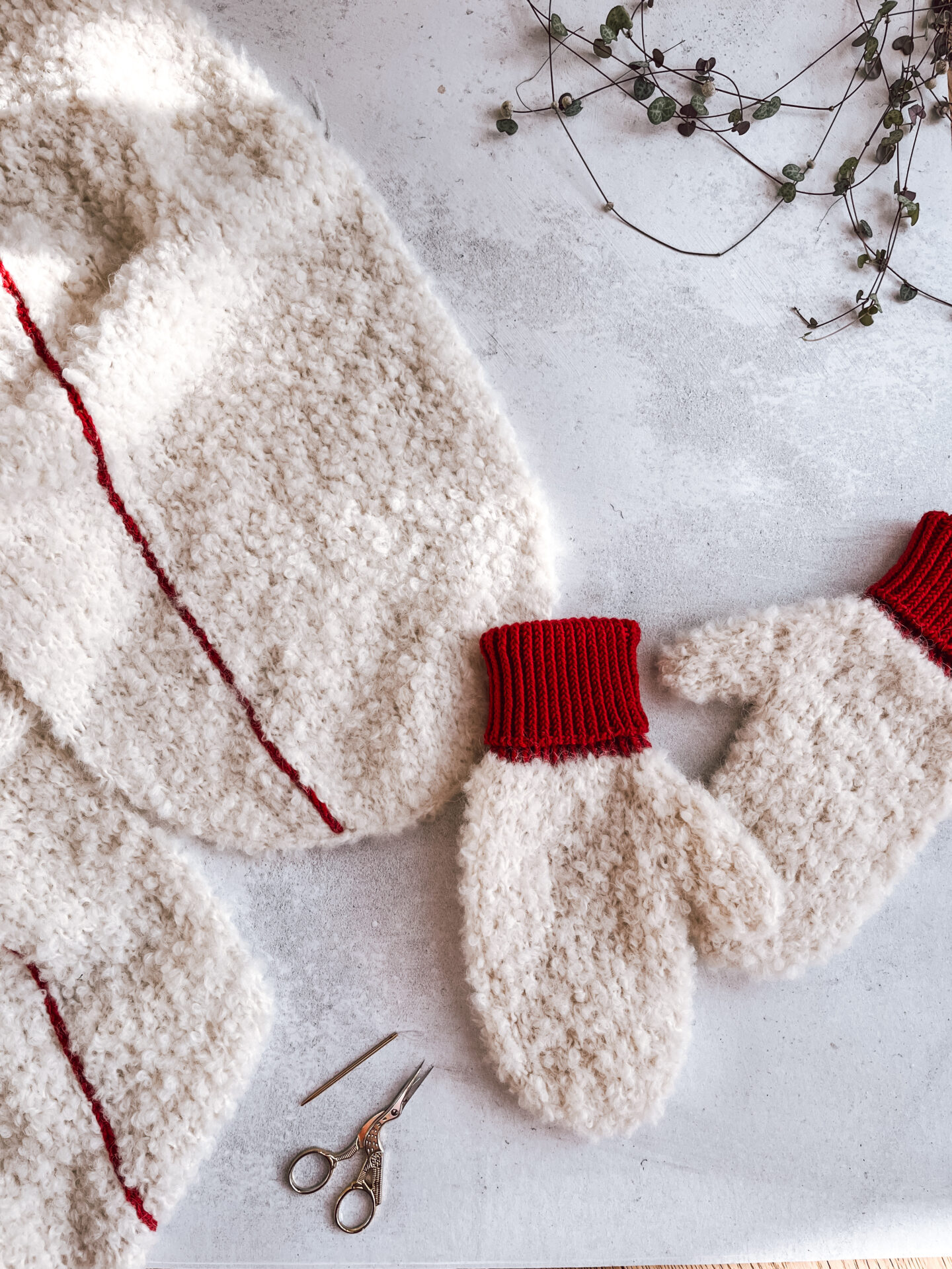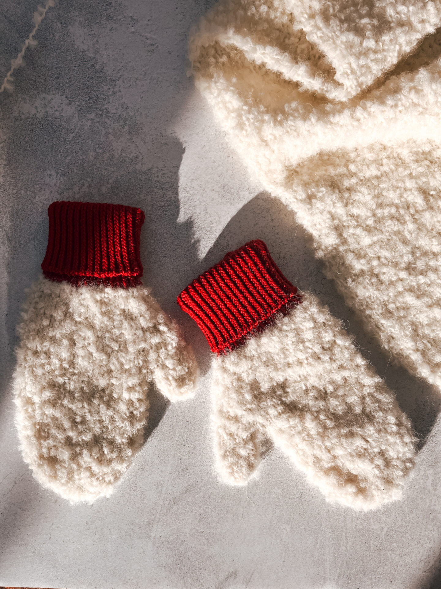 The mittens are worked seamlessly from the bottom up in the round. The main body is knitted in a plush bouclé yarn that creates a soft, fleece-like fabric with a comforting texture. Thumb stitches are set aside while the thumb gusset is shaped with carefully placed increases, allowing for a natural and comfortable fit. After the gusset is complete, the palm is worked straight to length before decreasing evenly for a rounded tip. The thumb is then picked up and worked separately in the round, finishing with a simple decrease crown.