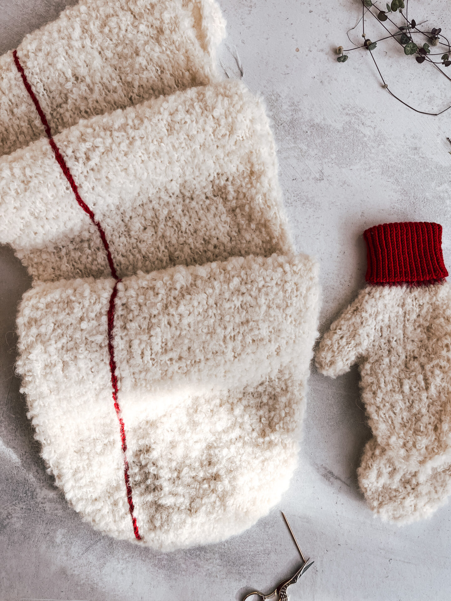 Gestrickt wird der Temple Schal überwiegend aus Lana Grossa Orsetto, einem flauschigen Bouclé-Garn aus 60 Prozent Merino und 40 Prozent Alpaka. Mit einer Lauflänge von 75 Metern pro 50 Gramm entsteht ein weiches, fast fleeceartiges Gestrick, das Wärme spendet und gleichzeitig leicht bleibt. Der Gesamtverbrauch liegt bei etwa 350 Metern, was fünf Knäueln entspricht. Für das dekorative Detail wird eine kleine Menge Kontrastgarn benötigt, etwa 10 Meter eines glatten DK-Garns wie Lana Grossa Cool Wool Big.