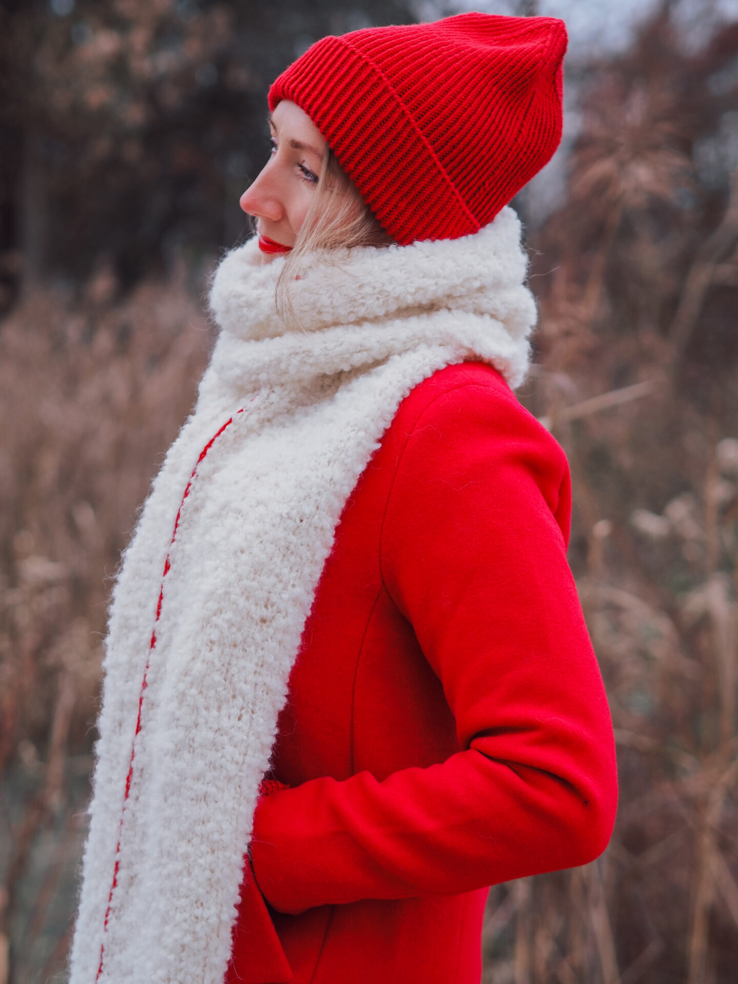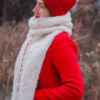 Nach dem Waschen und Spannen misst der Schal etwa 212 cm in der Länge und 28 cm in der Breite. Gestrickt wird mit 5,5 mm Nadeln oder der Nadelstärke, mit der die Maschenprobe erreicht wird. Diese beträgt 12 Maschen und 19 Reihen auf 10 cm glatt rechts im Bouclé-Garn.