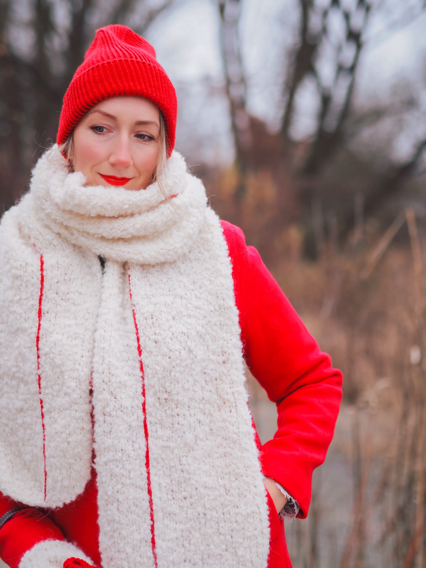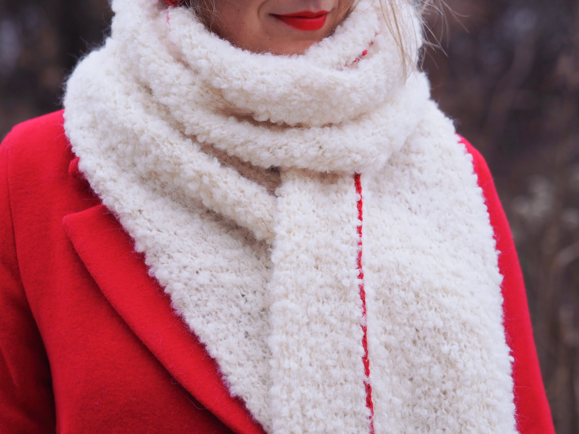 Am fertigen Schal wird eine dezente, vertikale Linie mit Kontrastgarn aufgestickt. Dieser faux-knit stitch erinnert optisch an eine rechte Masche und verleiht dem Design eine ruhige, klare Struktur, die Halt und Orientierung bietet, ohne aufdringlich zu wirken.