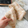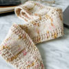 Tørklædet har en dekorativ kant med hulmønster, samt spidser der danner en fin afslutning på en sløjfe.