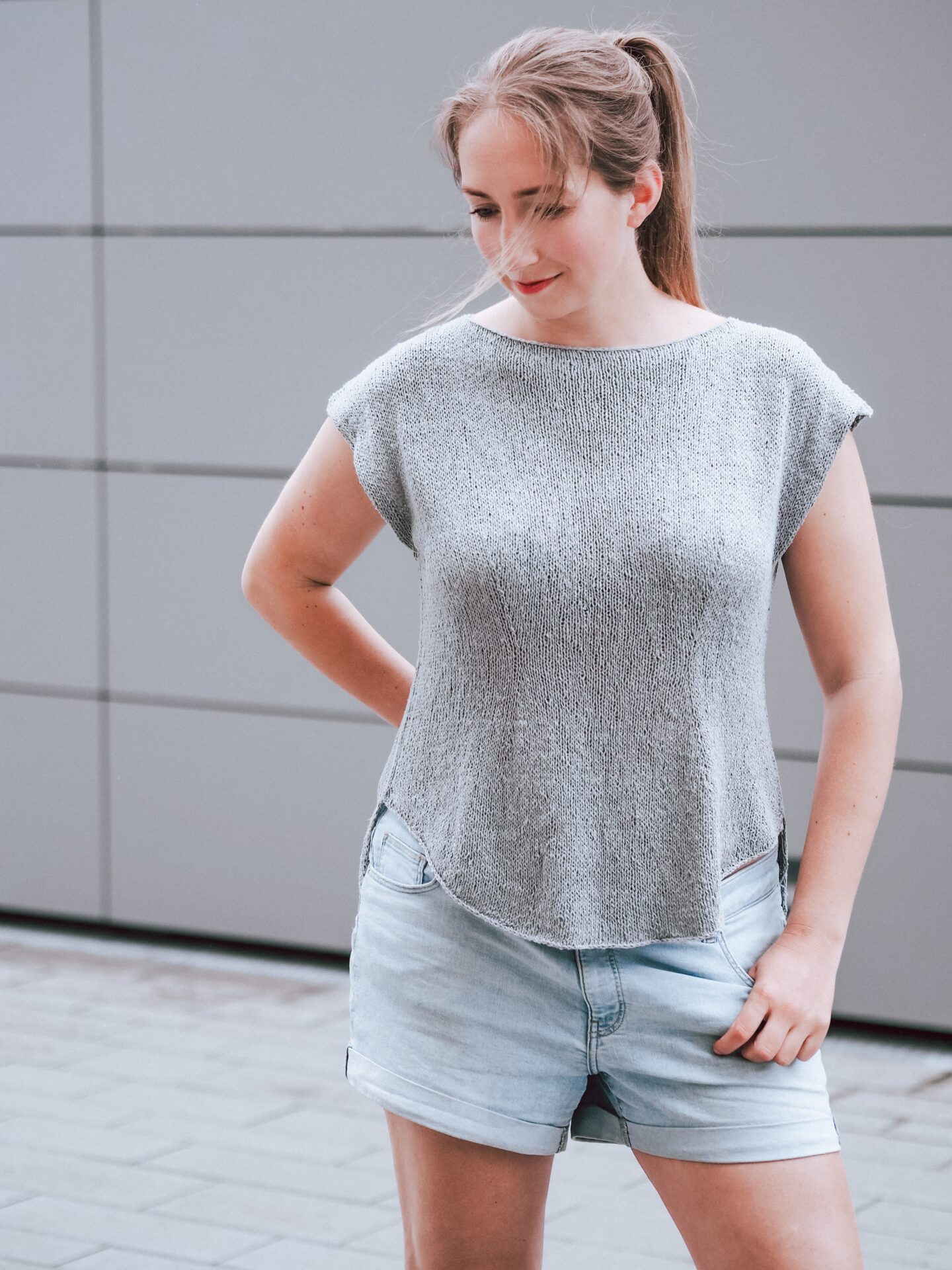 The Wilma Shirt is knit seamlessly from the top down, allowing for easy adjustments to length and fit. It features a flattering boat neck neckline and slightly dropped shoulders, creating a relaxed yet elegant silhouette. Subtle waist shaping defines the body without compromising comfort, while a decorative faux side seam runs along both sides of the garment. This detail continues into a split high-low hem, with a rounded front and a slightly longer back, adding movement and a contemporary finish.
