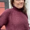 Sweateren kommer i størrelserne S (M) L (XL) 2XL og har et brystmål på henholdsvis 107 (115) 122 (130) 138 cm. Længden på sweateren målt midt bag er 55 (56) 57 (59) 60 cm, ekskl. rib i halsen. Den strikkes i det mellemtykke og luftige garn Rauma Fivel, som har en løbelængde på 100 meter pr. 50 g. Til modellen bruges der 450 (500) 550 (600) 600 gram af farve 06 – en smuk burgunderrød nuance. Det svarer til en total løbelængde på 900 til 1200 meter afhængig af størrelse.
