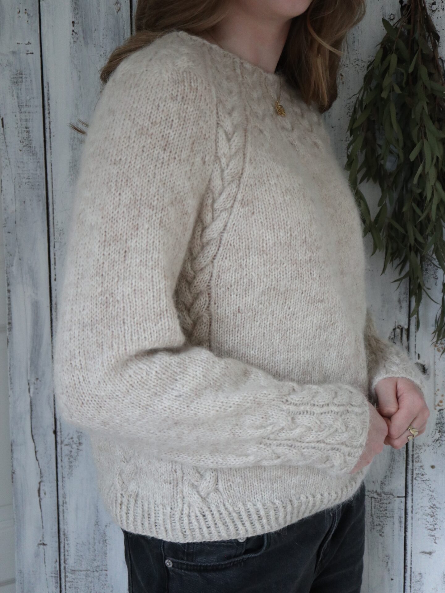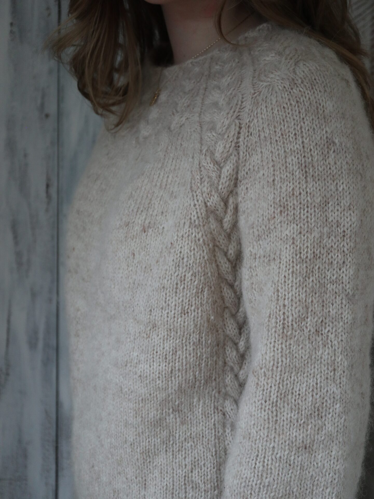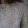 Opskriften er gennemarbejdet med tydelige udtagninger omkring fire raglanbjælker og løbende snoninger, som former pasformen. Kroppen strikkes i glatstrik med to kabler i hver side og afsluttes med drejet rib forneden; ærmerne strikkes lige ned og slutter med snoninger hele vejen rundt. Modellen er monteringsfri. Strikkefasthed: 17 m × 29 p i glatstrik på pind 4,5 mm = 10 × 10 cm (lav strikkeprøve). Vejledende pinde: rundpind 4,5 mm (60/80/100 cm og evt. 40 cm til ærmerne) samt 3,5 mm til aflukning ved ærmerne.