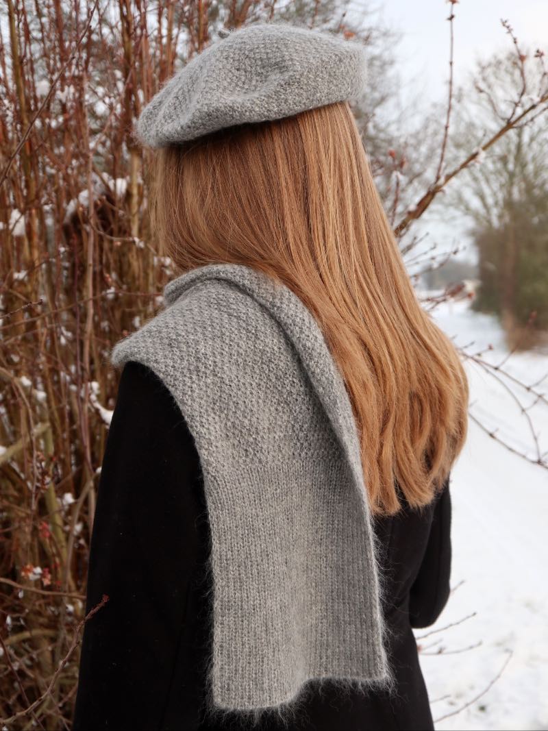 The scarf is knitted using 3.5 mm and 4.5 mm needles. The recommended yarn is Alpakka Silke from Sandnes Garn, held together with Silk Mohair from Isager, creating a warm yet lightweight scarf with a soft halo and elegant texture.